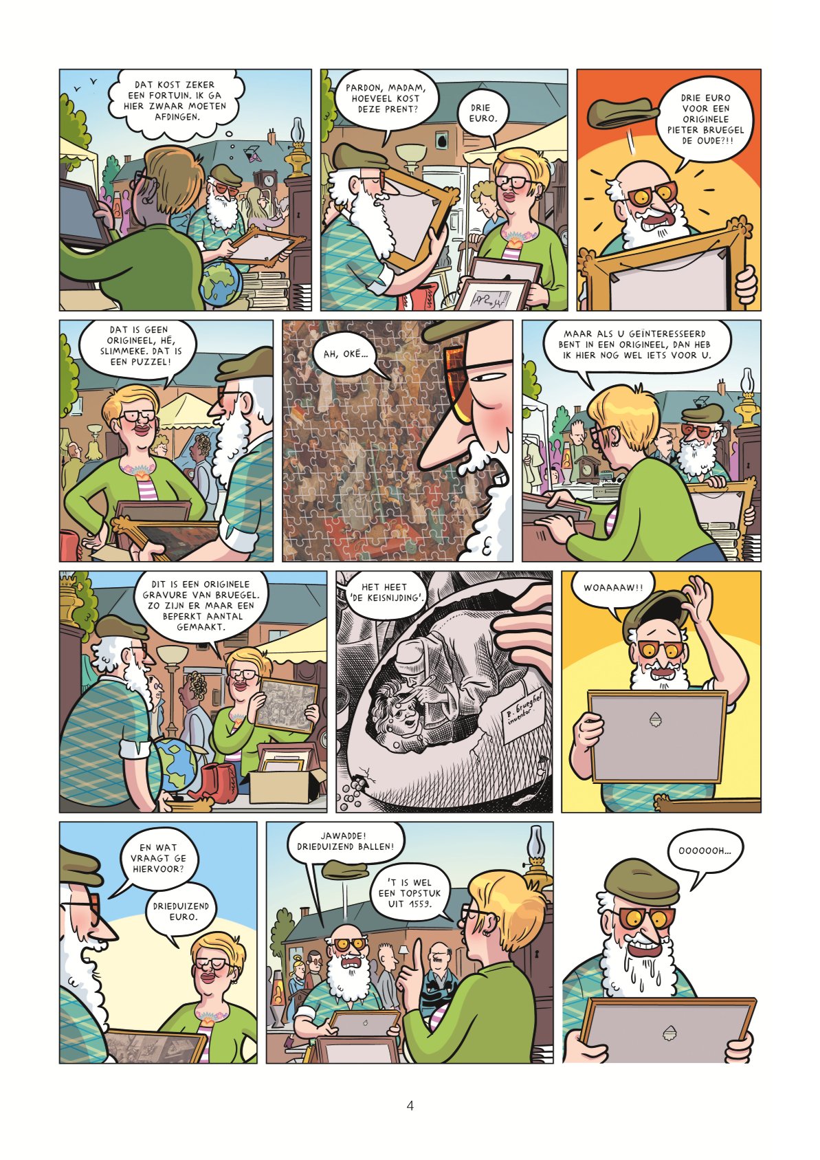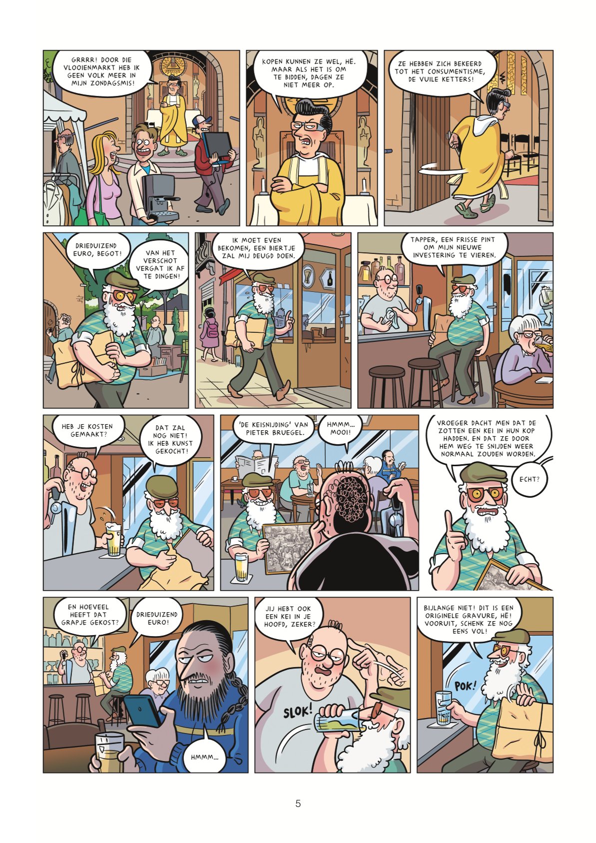 Score moyen 3 / 5Hé, dat is tof! Op de rommelmarkt doet ene Stafke de vondst van zijn leven. Voor slechts 3.000 euro kan hij een originele gravure van Bruegel kopen. Die kans laat hij niet liggen. De Keisnijding, waarop zotten genezen werden door een kei uit hun hoofd chirurgisch te verwijderen, is van hem. Zo fier als een gieter laat hij zijn vondst zien op café. Maar de muren hebben er oren. Nog diezelfde nacht wordt zijn gravure gestolen. Stafke betrapt de inbreker, maar die slaat hem een flinke buil waardoor hij in een diepe coma belandt. In zijn comateuze droom wordt Stafke in het Pajottenland van de zestiende eeuw gekatapulteerd, klaar om de echte Bruegel te ontmoeten. Het team van de Buurtpolitie doet er inmiddels alles aan om de kunstdief te klissen. Vooreerst onze verontschuldigingen. Wij zijn waarschijnlijk de allerslechtste man om dit album te bespreken. Op één matig album uit de beginperiode na hebben wij immers nog niets van De Buurtpolitie gelezen. De tv-reeks is ons al helemaal onbekend. Als we onze omgeving mogen geloven, moeten we geen spijt hebben dat we de vtm-reeks gemist hebben. De Buurtpolitie-acteur Andy Peelman (waar onze darmen spontaan van openstaan als we die zappend in een of andere BV-show of -quiz tegenkomen) heeft er wel voor gezorgd dat we de strips al die tijd totaal links hebben laten liggen. Nochtans staan alle Kinky & Cosy’s van Nix wel terecht in onze stripbibliotheek. Waarom we nu wel deze strip hebben gelezen? Niemand minder dan diezelfde Nix neemt samen met tekenaar Charel Cambré de zware erfenis van de Kiekeboes over. We zijn benieuwd of dit zal lukken. De Keisnijding is alleszins een heel dikke meevaller. Het album opent met een geweldig rommelmarktprentje waar we zelfs een besnorde, kalende man met een bruine jekker opmerken. Fijntje. Het verhaal zit prima in elkaar volgens de regels van de kunst. Zo zijn er cliffhangers op elke om te draaien pagina. Banaal, maar zo efficiënt. De stijl is zwierig. Het ritme blijft het hele verhaal door snor zitten. De kadrering is klassiek, maar toch fris. Als volwassen lezer van deze jeugdstrip kunnen we ons hart ophalen aan de vele Breugel-verwijzingen die Nix via zijn eigen versie van de teletijdmachine oproept. Eigenlijk zou dit evengoed een Suske en Wiske kunnen zijn. Of met wat extra Merho-vocabularium een prima de Kiekeboes. Met de humor zit het alvast goed. Dit is gewoon dikke fun. Of de stripreeks van De Buurtpolitie nog iets te maken heeft met de gelijknamige tv-serie weten we niet en gaan we ook niet uitzoeken. Deze strip is alleszins de grappigste Vlaamse familiestrip voor het hele gezin die we sinds lang hebben gelezen. Een (te late) ontdekking voor ons.
