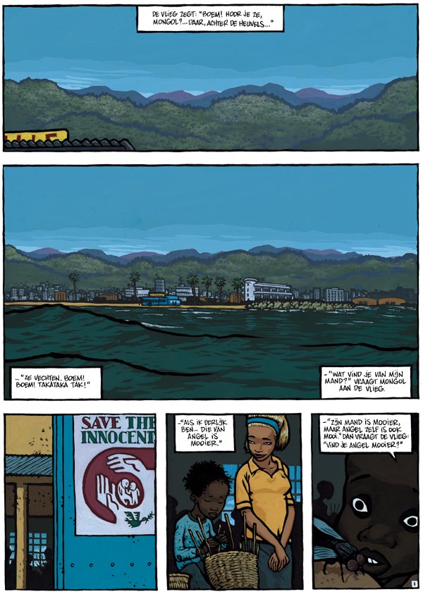 Een stad wordt omgeven door heuvels van waaruit oorlogsgedonder weerklinkt. In een atelier van het hulpproject Savinn' leren kinderen manden te maken, min of meer met plezier. Mongol doet erg zijn best. Hij wil zich laten opmerken bij Anika. Maar hij legt het niet goed aan boord en Anika heeft meer belangstelling voor Angel, die de knappe Zweedse weet te ontroeren. Angel zegt dat hij hoofdpijn heeft en hij vertelt haar over de dood van zijn ouders. De ouders van Mongol zijn niet dood... Of misschien toch... Eigenlijk weet hij het niet meer. Maar hij heeft wel hoofdpijn. Alleen, hij kan er niet over praten en dat is zijn probleem. Hij kan slechts converseren met dieren. Vooral dan met vlieg. Niet dat hij de taal van de dieren spreekt, zoals Anika en haar kleine Afrikaanse echtgenoot denken. Hij verzint gewoon liever zelf de antwoorden op de vragen die hij stelt.