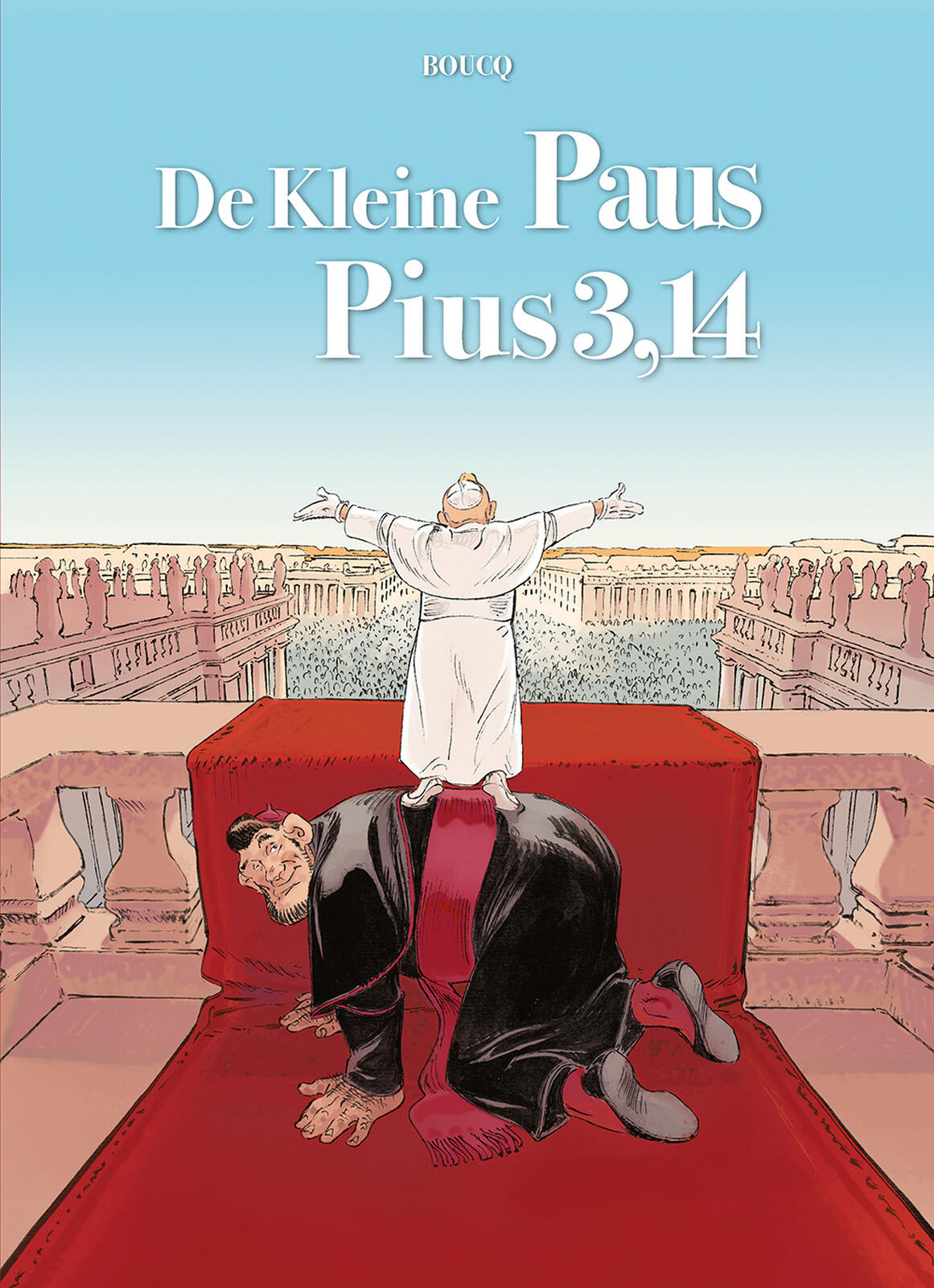 De Kleine Paus Pius 3,14 (januari) 'Het conclaaf heeft zojuist een nieuwe paus gekozen in de persoon van Pius 3,14. De menigte gelovigen verzamelt zich en ontdekt een paus zo groot als drie appels, maar zeer kleurrijk! Hij is klein van gestalte, maar groot van hart. Zijne Heiligheid de paus wil van iedereen zijn, zonder uitzondering. Hij is zo nederig dat hij zijn pausmobiel heeft ingeruild voor een eenvoudige kinderwagen. En hij is zeven dagen per week bereikbaar op een gratis nummer! Vergezeld van Gontrand, zijn trouwe bisschop met een imposante lengte, beleeft Pius 3,14 enkele ongelooflijke avonturen, van plechtige audiënties tot fantasievolle zegeningen voor zombies, waaronder een onwaarschijnlijke redding van de wereld samen met Superhyperman. Deze kleine paus, Pius 3,14, zal zeker zijn stempel drukken! François Boucq, bekend van de western Bouncer, keert terug naar het satirische genre met deze korte verhalen over de kleinste paus in de geschiedenis.'