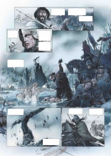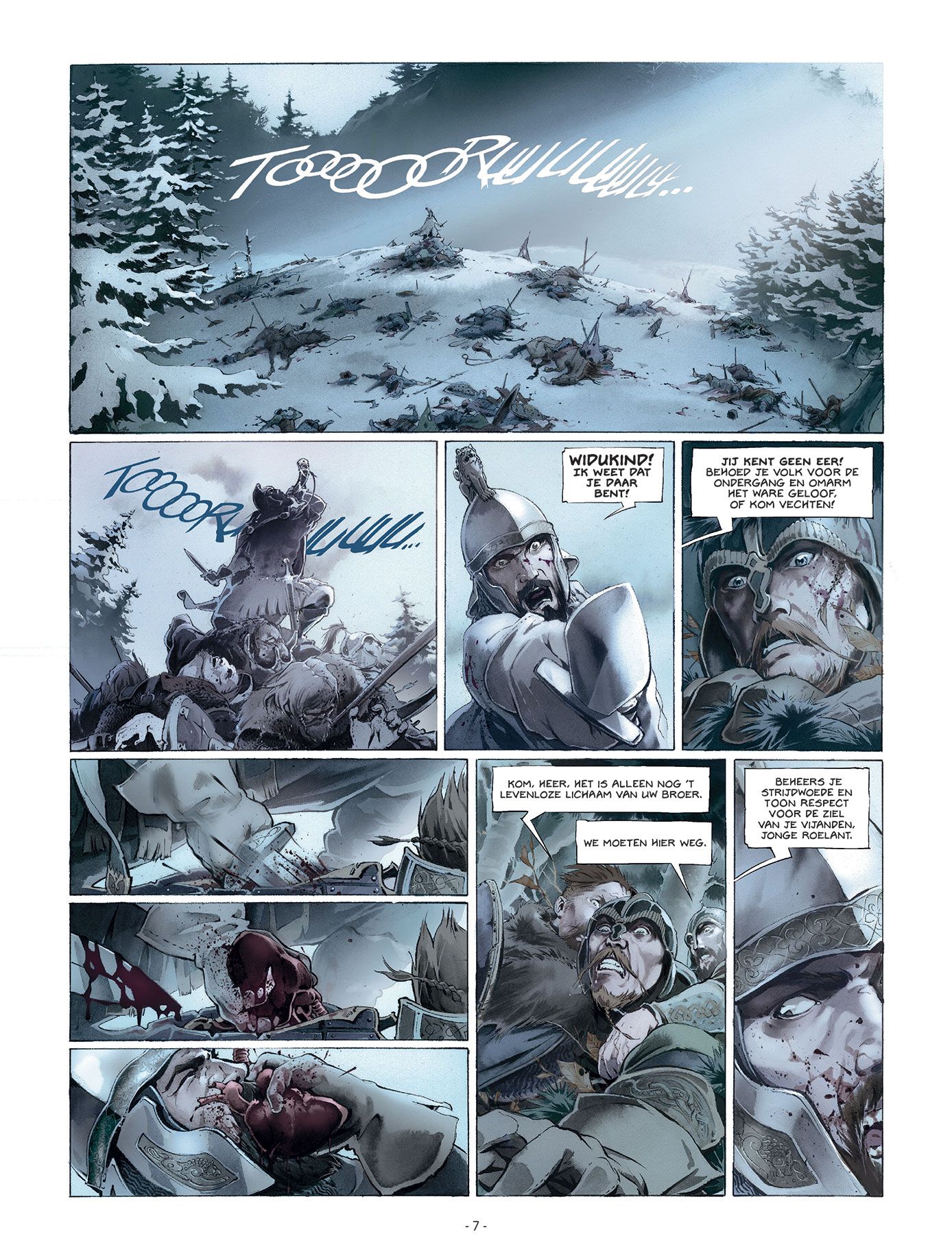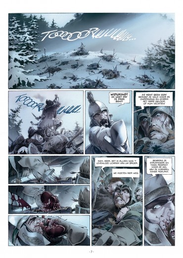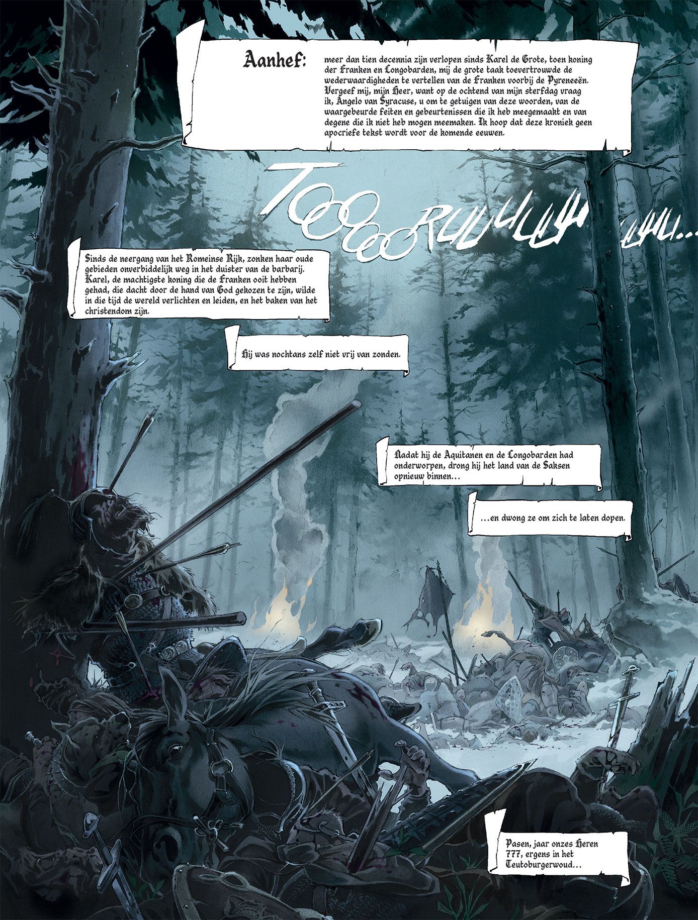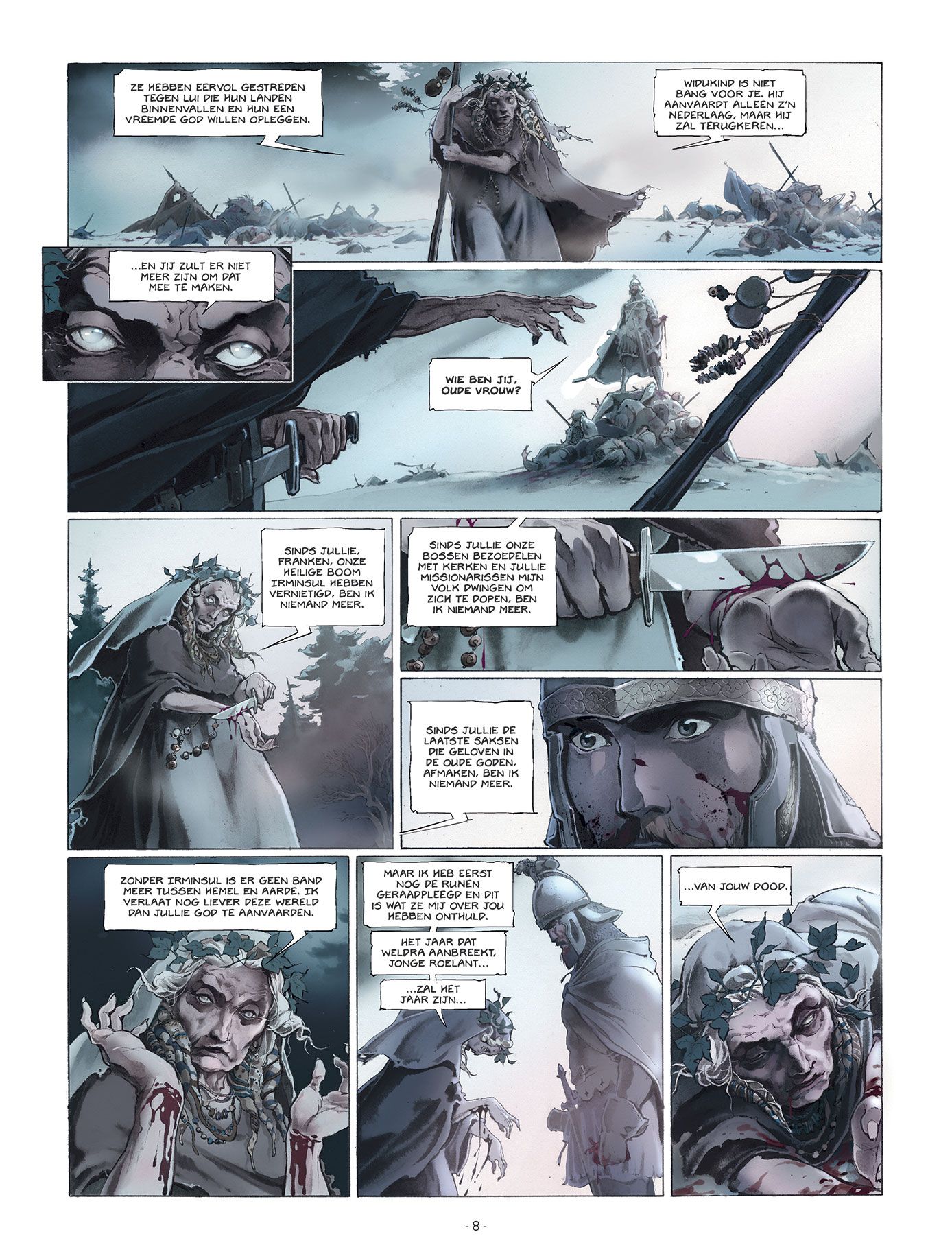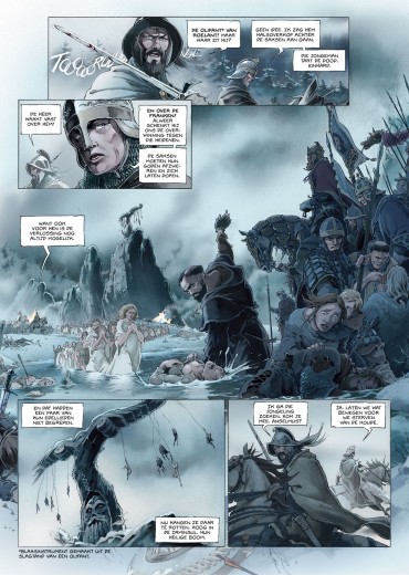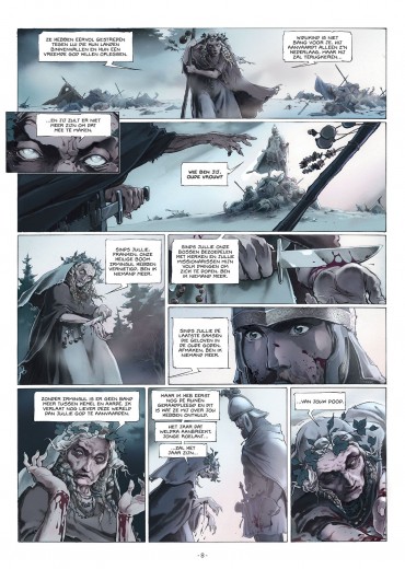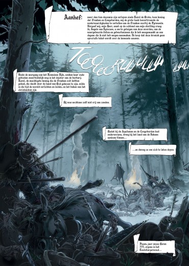 Score moyen 4 / 5777. Karel de Grote, de koning der Franken, bouwt lustig verder aan zijn grote Europese rijk. Een voor een worden zijn tegenstanders verslagen in bloederige veldslagen en bekeerd tot het Christendom. In zuidelijke richting vormt het Saraceense Spanje hem een doorn in het oog. De Saracenen zijn echter onderling verdeeld. Soleiman Ibn Yazqan Al-Arabi, leider van enkele grote noordelijke steden, voert een opstand tegen Abd Al-Rahman, de emir van Cordoba en hoogste leider van de Saracenen in Spanje. Bovendien ook public enemy nummer 1 van Karel de Grote. Soleiman wendt zich tot Karel om militaire hulp, in ruil voor de belangrijke Noord-Spaanse stad Zaragoza. Karel ruikt bloed en trekt met de Frankische gevechtsmachine richting Pyreneeën. Onder zijn trouwe schare volgelingen bevindt zich ridder Roelant. Een onversaagde durfal die steeds in de voorste linies te vinden is. Meer dan eens redt hij de Frankische meubelen. Niet altijd evenzeer naar de zin van zijn koning... Juan Luis Landa (Arthus Trivium) verzorgt voor Kronieken van Roncevaux zowel het scenario als de tekeningen en de inkleuring. Landa levert alvast geen half werk af. De lezer wordt middels een introductie door chroniqueur Angelo van Syracuse midden in de actie gedropt. Aan een stevig tempo werkt Landa toe naar de confrontatie tussen het leger van Karel de Grote en dat van Abd-Al Rahman. Een belangrijke kanttekening hierbij is de rol van de christenen die de regio van het huidige Baskenland bewonen. Zij blijken immers geen fan te zijn van Karel de Grote en stellen hun onafhankelijkheid nogal hard op prijs. Hiermee wordt meteen ook een parallel naar de huidige toestand in de regio getrokken. De karakterontwikkelingen zijn zuiver gericht op de strijd. Verwacht dus geen uitgebreide karakterschetsen of een blik in het persoonlijke leven van bepaalde geschiedkundige figuren. Het zijn stuk voor stuk helden met een verkeerd kantje. Zo ook Roelant, de man waar het in dit eerste deel tenslotte grotendeels over gaat. Door het verhaal te laten vertellen door Angelo van Syracuse, een goede honderd jaar na de feiten, krijgt de lezer alvast mee dat het verhaal met een grote korrel zout genomen moet worden. Wat het tekenwerk betreft kunnen we kort zijn... Wauw! Actie, karakterkoppen, sfeer, ruwe landschappen, chaos,... Nog meer dan het sterke en rauwe verhaal wist het tekenwerk ons volledig mee te nemen in de legende van Roelant. Dit eerste deel van Kronieken van Roncevaux doet ons reikhalzend uitkijken naar het vervolg. Ook al kennen we uit de geschiedenislessen reeds het einde van het verhaal, op deze manier verloopt de rit toch nog een stuk aangenamer. Bovendien zijn we benieuwd hoe Landa de Baskische twist in het vervolg zal verwerken.