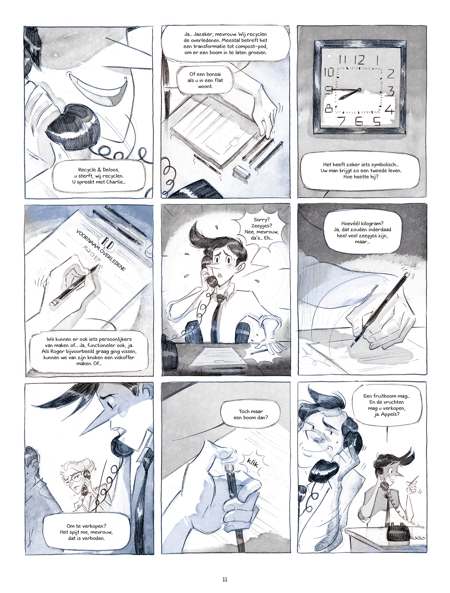 Eén adres voor het recycleren van overledenen: Recycle & Deloos. Charlie, medewerker van de klantendienst, is er het zonnetje in huis en verkoopt elke creatieve recyclage in een mum van tijd.