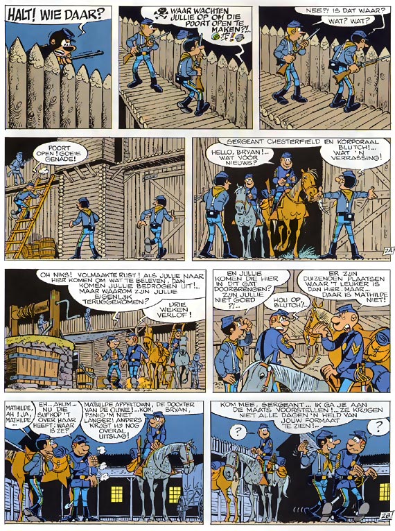 De reeks 'De Blauwbloezen' is een geslaagde mengeling van avontuur en humor. Cauvin gebruikt - zoals hij wel meer doet - historische anekdotes uit de Amerikaanse burgeroorlog om ons hilarische verhalen te vertellen over de perikelen in het leger, waar de hoogste officieren niet per se de slimste zijn... Willy Lambil heeft zich uitstekend gedocumenteerd en maakt van zijn pagina's heldere, intelligente kunstwerkjes. Het resultaat is amusement op hoog niveau, dat door een nog steeds groeiend publiek wordt gewaardeerd.