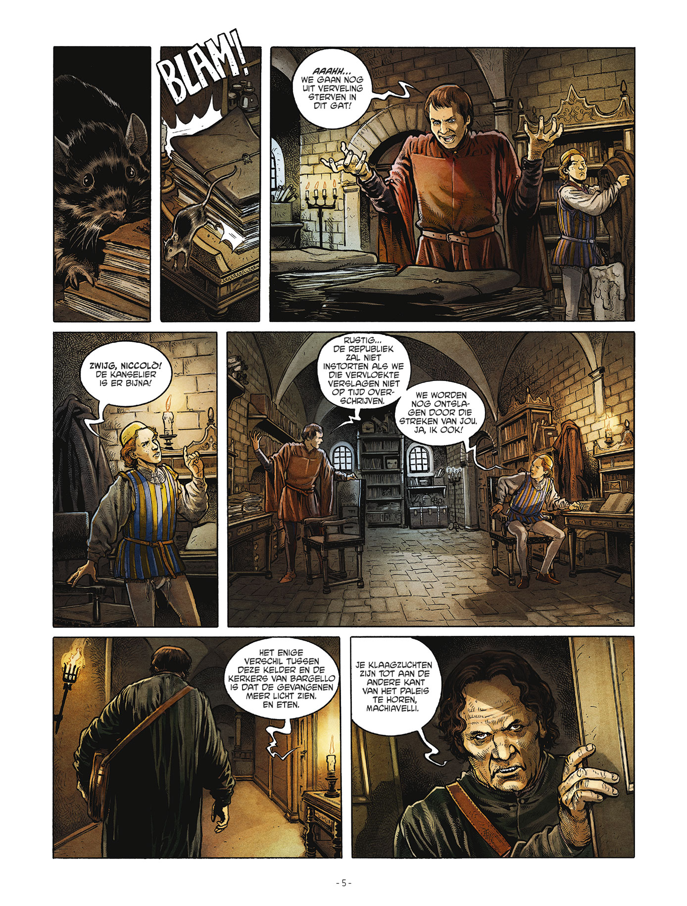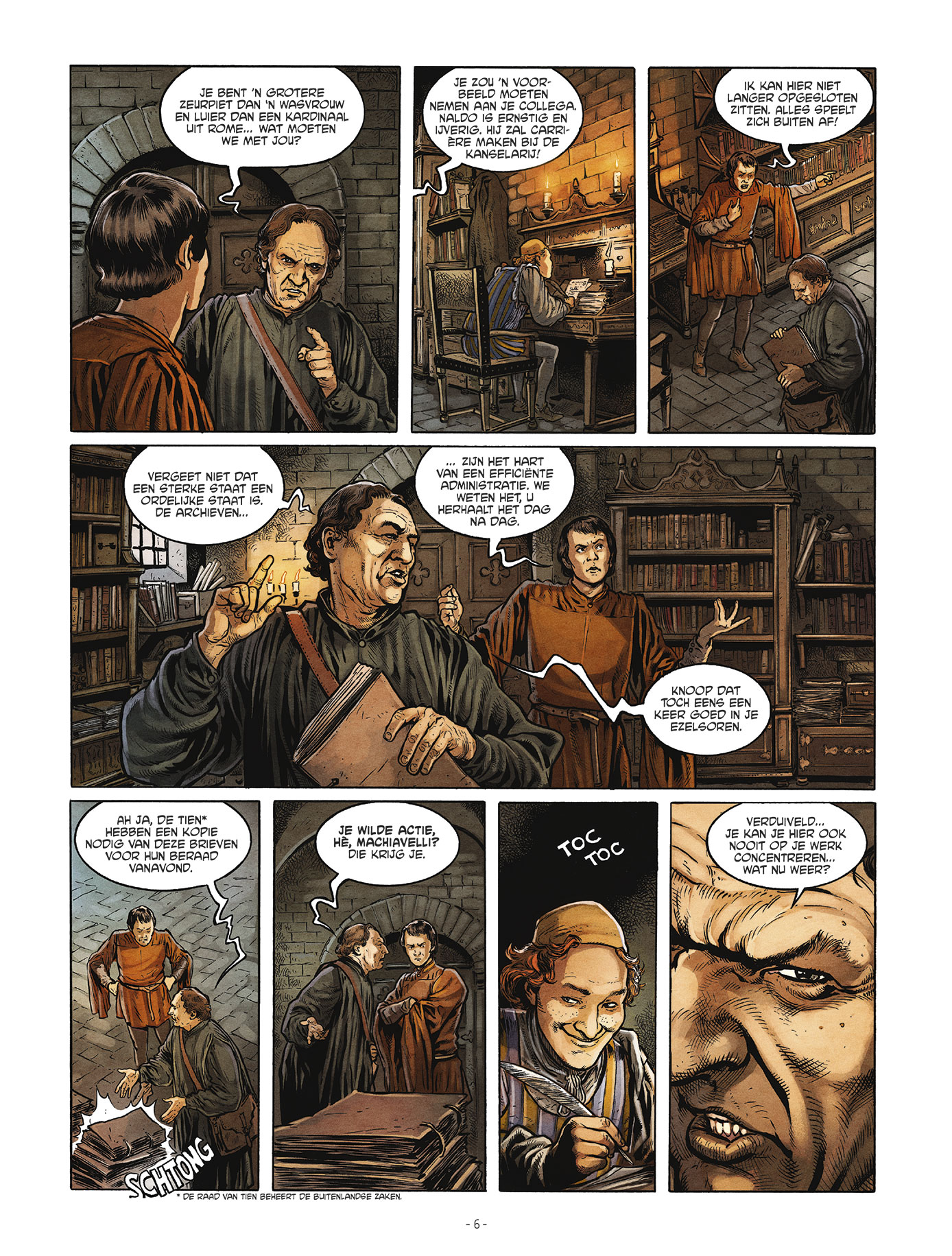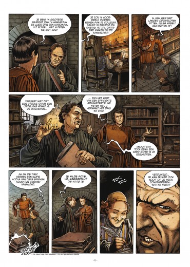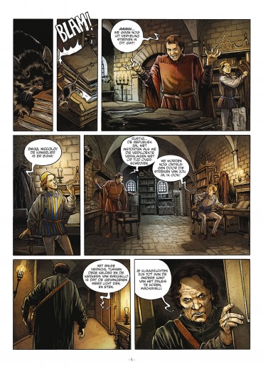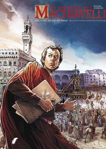 Score moyen 4 / 5Naast de succesvolle reeks van De’ Medici brengt Daedalus deze nieuwe reeks over het leven van Machiavelli uit. Benieuwd of dit eerste album ons ook weet te overtuigen. Niccolò Machiavelli is een inspirerende naam die dikwijls met wijsheid en diplomatie geassocieerd wordt. Denk maar aan het gezelschapsspel Machiavelli waar je slim de keuze moet maken welk karakter je aanneemt. Hij geldt dan ook als grondlegger van de huidige politieke wetenschappen. In dit album volgen we Machiavelli als twintiger als Firenze in 1498 woelige tijden beleeft als republieke staat. Hij werkt dan onder de kanselarij en vult zijn dagen met papieren te kopiëren, niet hetgeen hij zijn hele leven lang wilt doen. Tot hij gevraagd wordt om een verslag te noteren van een vermoorde man die in de rivier Arno teruggevonden is. Na wat onderzoek blijkt er een onuitwisbare, zwarte vloeistof aan zijn handen te hangen en vinden ze een manuscript terug in zijn wambuis. Daarop is de naam van een nabij gelegen dorp te lezen. Machiavelli en de onderzoeker besluiten dit spoor maar te volgen, maar daar ter plaatse worden ze aangevallen door 3 huurmoordenaars.. Intussen wordt de aanvoerder van de republiek, Savonarola, aangeklaagd door een De’ Medici wegens verraad nadat een document naar boven komt dat hij voor de Franse koning zou zwichten. Overleven Machiavelli en zijn onderzoeker de aanval van de bende huurmoordenaars ? En wat met het politieke spel die intussen gebeurt in Firenze ? Scenarist en docent Italiaanse literatuur Jean-Marc Rivière volgt in grote lijnen het leven van Machiavelli en voegt daar een mooie twist aan toe met het verhaal over de moord. Alles valt ook mooi in zijn plooi naar het einde van het album wat verhalend leuk is om te lezen. Als er al een punt van kritiek gegeven kan worden, is dat het karakter van Machiavelli naar mijn gevoel nog verder ontwikkeld mag worden. In dit album lag de nadruk te veel op het onderzoek van de moord. De tekeningen door Gabriel Andrade zijn meer dan goed te noemen. Vooral de expressies die hij weet te brengen, maken indruk. Wat wel soms stoort, is het overmatig ‘gekras’ in de gezichten die hij weet te gebruiken om schaduweffecten toe te voegen. Maar dat is een detail in vergelijking met wat deze strip je te bieden heeft. Daedalus heeft opnieuw een mooi begin van een historische reeks te pakken, altijd leuk om zo’n verrassing te ontdekken !