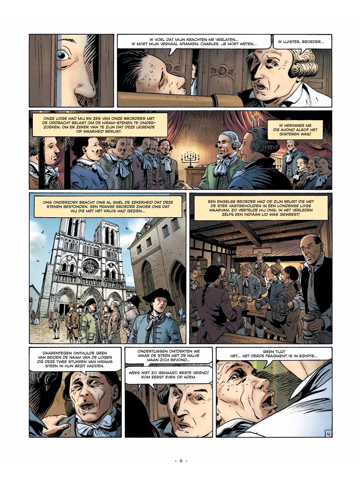 Een reeks uit 12 delen die volgens planning in3 jaar zou moeten verschijnen. Telkens complete verhalen met extra-dossier. Stripscenarist van de partij is Boisserie Pierre ( onder leiding van Convard) die we kennen van volgende stripreeksen: 1. De Bankier van het rijk 2. Dantes 3. De Bank 4. Flor de luna 5. Het Kruis van Cazenac 6. Nakara 7. Reiziger 8. Roma 9. Sint Bartholomeus 10. Wolf Verwacht november Teveel ambitie kan de ziel verteren. Egypte, 1798. Generaal Bonaparte marcheert naar Alexandrië en wordt achtervolgd door het verhaal van de stenen van Hiram. Na het bemachtigen van de heilige steen in de piramides, keert het tij in zijn voordeel. Napoleon schrijft zijn ontelbare successen toe aan het mysterieuze relikwie. Tijdens dezelfde campagne richt generaal Kléber de eerste vrijmetselaarsloge in Egypte op en nodigt Napoleon uit om ingewijd te worden. Joséphine de Beauharnais speelt een cruciale rol in de schaduw. Dit achtste deel neemt ons mee naar politieke intriges en de oorsprong van de vrijmetselarij. Het epos van de vrijmetselaars 8. De droom van het oosten Tekst: Convard & Boisserie Tekeningen: Éric Lambert ISBN: 9789464604061
