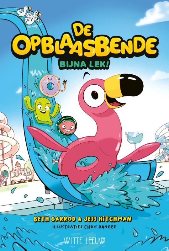 Flamingo, Cactus, Donut en Watermeloen zijn vergeten opblaasfiguren die op de afdeling gevonden voorwerpen wonen. Flamingo wordt een ster! Dat weet de opblaasbende zeker, dus als de feestelijke opening van het nieuwe golfslagbad allerlei cameraploegen het waterpark in lokt, bedenken ze een gedurfd plan om hem beroemd te maken. Of zal een zwerm vreemde vogels uit het verleden Flamingo’s droom als een zeepbel uit elkaar laten spatten? Zet je schrap, wereld, want Flamingo gaat de boel OPBLAZEN! Vertaald door Marjolein Algera, de vertaalster van Kapitein Onderbroek.