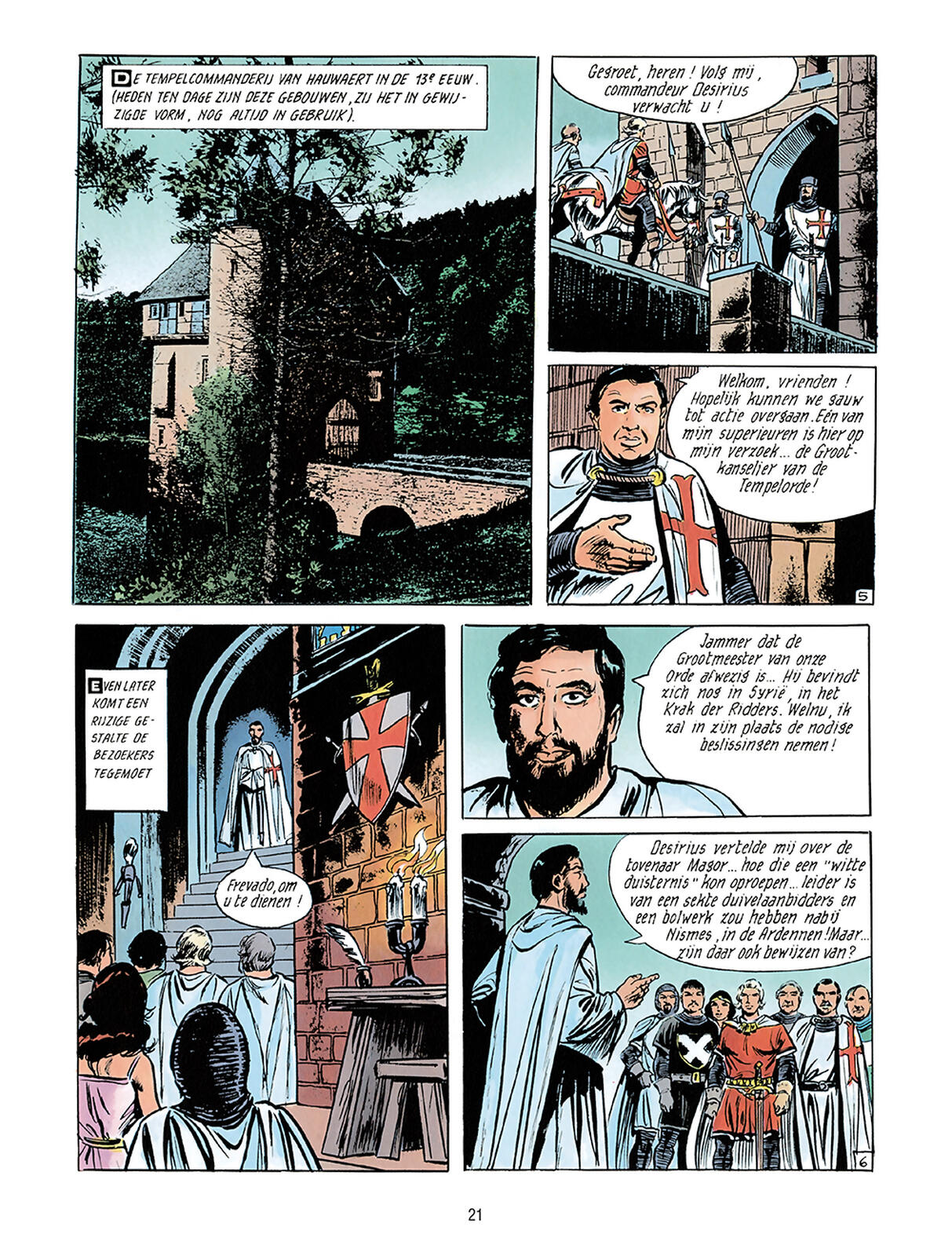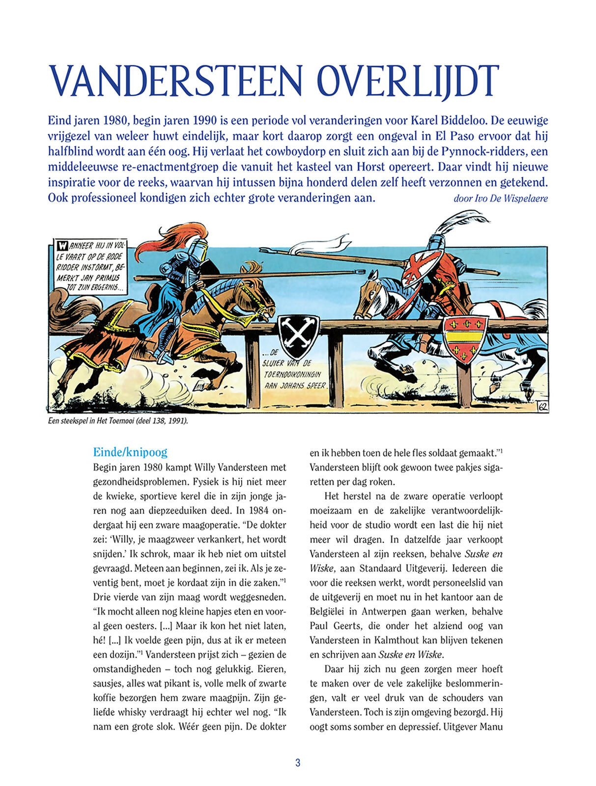 Met ex-libris Met deze integrale in de cyclus Sword and Sorcery zijn de eerste tachtig verhalen van De Rode Ridder in een integraal jasje heruitgegeven met dossiers. Volgend jaar zullen opnieuw vier integrales verschijnen met een cyclus waarin opmerkelijk veel monsters en aliens opduiken. Die cyclus zal de oorspronkelijke delen 81 tot 130 bevatten, dus tot net voor de Horst-albums. Deze cyclus zal ook zeven integrales omvatten met telkens zes of zeven verhalen in 2022 en 2023. Omdat die nog steeds vallen onder de Karel Biddeloo-jaren gaat de nummering verder van deel 8 tot 16. Verder in de toekomst liggen nog twee cyclussen tijdens de Biddeloo-jaren voordat de jaren van Claus worden aangesneden. Het dossier in deze zevende integrale vertelt een hoop over Biddeloos achtergrond als cowboy in het westerndorpje El Paso. Hij tekende zichzelf ook als Kilyon in het gebundelde verhaal De Vete. Bovendien bevat deze integrale een komisch, kort verhaal van 2,5 pagina's uit 1977 dat toen in Ciso Stripgids verscheen. (ssz) Dossier: 14 pagina's, samengesteld door Ivo De Wispelaere. Biografische achtergrond met foto's over Karel Biddeloo, die zichzelf heeft getekend in het verhaal De Vete. Aandacht voor het stijgende humorgehalte in de reeks. Over elk album is ook een pagina samengesteld waarin historische, culturele of andere verwijzingen, opgemerkte details en anekdotes staan verzameld. Oorspronkelijke albumcovers: In verkleinde vorm bij de albumvoorstellingen in het dossier. Geen oorspronkelijke titelpagina's en backcovers. Nieuw gemaakte titelpagina's, met een uitvergroot fragment van een prent, gaan elk gebundeld verhaal vooraf. Compleet: Alle verhalen in de chronologische volgorde, afgedrukt in donkerblauwe kleur. Voor deze uitgave zijn alle strippagina's opnieuw ingescand op basis van eerder gedrukte albums. De oorspronkelijke drukfilms waren niet meer beschikbaar of bruikbaar. De originelen zitten verspreid bij verzamelaars. De oorspronkelijke reproductie voor de albums hield toen al vaak detailverlies in. Het goedkope papier, dat makkelijk vergeelde en waarop de inktlijnen uitliepen of verdikten, vergemakkelijkte het inscannen niet, maar de scans zijn zo goed en zo kwaad als het ging opgepoetst. De oorspronkelijke lettering is behouden. Om de integrale reeks te behappen, besliste Standaard Uitgeverij om de verhalen op te delen in opeenvolgende periodes. De tweede periode, De Biddeloo-jaren: Sword and Sorcery, bestaat uit de delen 37 tot 80, verdeeld over zeven integrales. In deze integrale staat ook het korte, komische verhaal Een Eenzame Ridder, Ver van Huis opgenomen dat in Ciso Stripgids nummer 14 uit 1977 verscheen. Gebundelde verhalen* Deel 74: De Vete (34 pagina's uit 1976) Deel 75: De Hellebron (34 pagina's uit 1976) Deel 76: De Barbaar (34 pagina's uit 1977, niet in de krant voorgepubliceerd) Deel 77: De Galeislaaf (34 pagina's uit 1976-1977) Deel 78: Het Verloren Legioen (34 pagina's uit 1977) Deel 79: De Banneling (34 pagina's uit 1977) Een Eenzame Ridder, Ver van Huis (2,5 pagina's, 1977) Deel 80: De Schildknaap (34 pagina's uit 1977) * De jaartallen zijn die van de eerste publicatie in de krant. (Bron SSZ)
