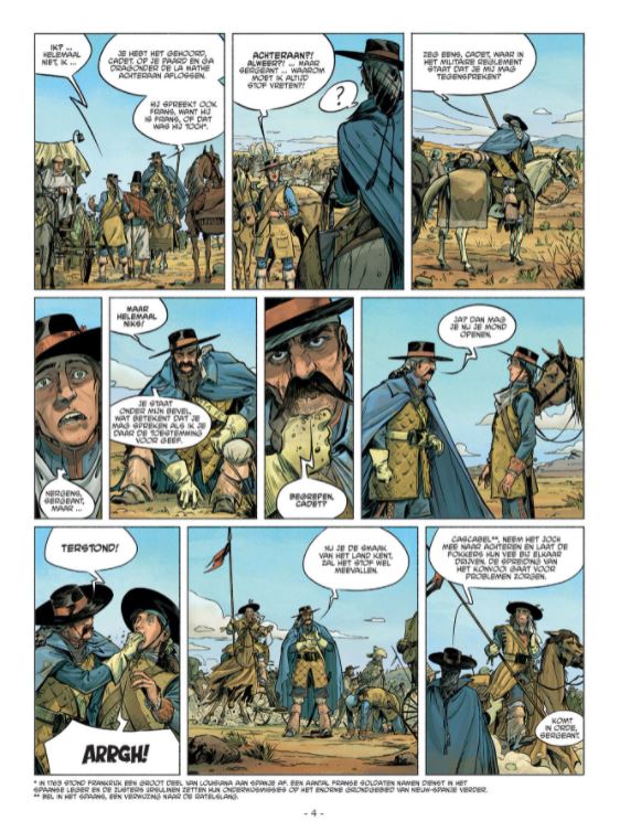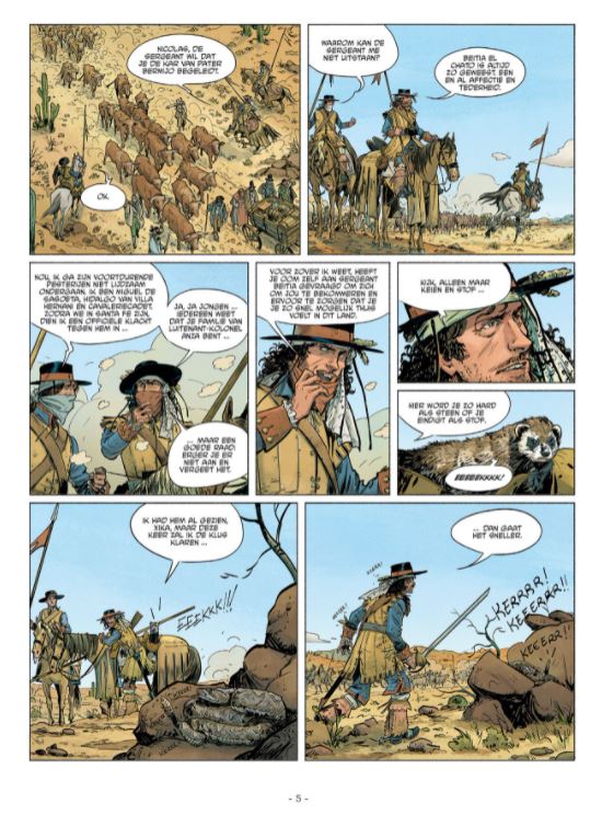 Mei 1774. Miguel, een jonge cadet die nog maar net uit Europa is aangekomen, is een ‘Dragón de Cuera’, een van de beruchte Spaanse lansiers die de Noord-Amerikaanse grens bewaken. De lansiers vergezellen een konvooi van kolonisten en vee,wanneer ze door Apachen worden aangevallen. De Apachen ontvoeren zuster Madeleine, een non die samen met het konvooi op weg was naar Santa Fe. Miguel zet onmiddellijk de achtervolging in. Het is het begin van een inwijdingsavontuur voor de jongeman die in het hart van de strijd tussen de Spaanse cavalerie, Apachestammen en de Comanches belandt. De Spaanse scenarist, Gregorio Harriet, neemt de lezer mee op ontdekkingstocht naar het Nieuw-Spanje van de 18e eeuw. Het resultaat is een atypische western, waarin je kennismaakt met een uniek stukje van de geschiedenis van de Nieuwe Wereld. De ‘dragones de cuera’ zijn legendarische ruiters, want een dragón de cuera word je niet zomaar... Hun opvallendste kenmerk is de ‘cuera’, de lederen vest in verschillende lagen die hen beschermen tegen indianenpijlen. Met de tekeningen van Iván Gil proef je het zand van de onherbergzame rotswoestijn, voel je de brutale wreedheid van de indianen. Een niet te missen western, en een fraaie toevoeging aan het rijke universum van de westernstrip.