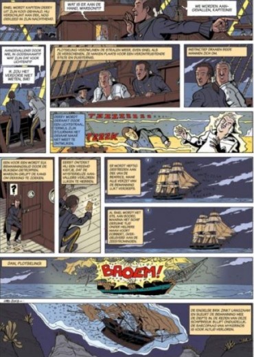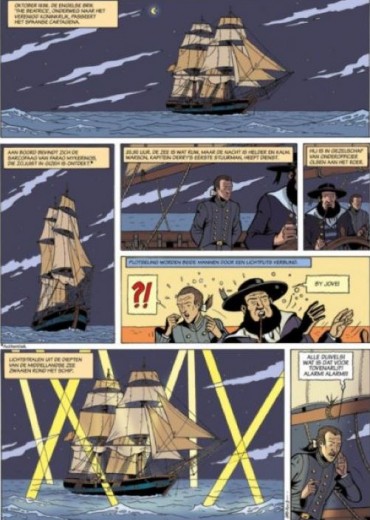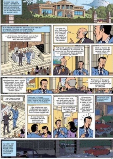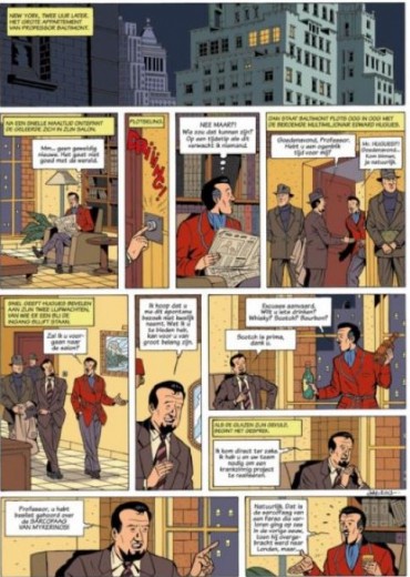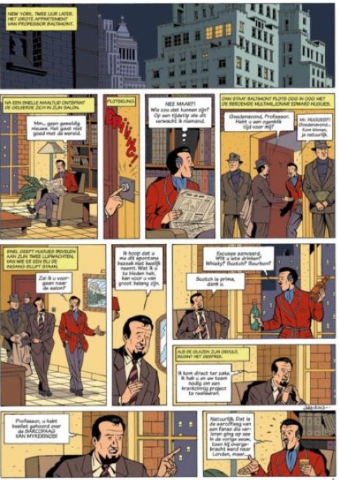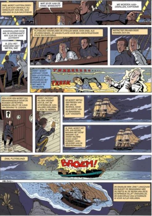 deel1/3 Oktober 1838. De Engelse brik “The Beatrice” is op weg naar het Verenigd Koninkrijk met aan boord de sarcofaag van de farao Mykerinos. Om nogal obscure redenen verdwijnt het schip nabij Cartagena (Spanje) in zee, en neemt daarbij de sarcofaag van de beroemde koning van Egypte mee de diepte in. 1952. De getalenteerde natuurkundige professor Baltimont voltooit zijn werk aan een speciaal edelgas genaamd Zargon. Dit gas kan de mens laten ademen in tot dusver ontoegankelijke zeediepten en opent daarmee perspectieven voor het veroveren van alle onderzeese gebieden van onze planeet. De Amerikaanse miljardair Edward Hugues doet een beroep op Baltimont en vraagt hem of hij wil helpen bij een waanzinnig project, namelijk de sarcofaag van Mykerinos vinden. BLAKE EN MORTIMER VAN DEN ALDI De recensent opende het boek en begon te lezen. Zijn eerste indrukken waren dat dit hem nogal bekend voorkwam... — By Jove, dit komt me bekend voor! — Professor Blakimortimont! Ik bedoel... Balketimer... eh... Baltimont! — Ja, lieve Vera? — Zeg, professor, ik ben uw assistente, niet uw liefje! — Damned, Vera! Wat wil je? Als professor in alles ben ik wel in voor een avontuur! — Me too, professor! Maar... De professor en zijn assistente schrokken toen plots een luide klap klonk... CBOO! — Wat een luide klap! — En zo plots! Een vreemde figuur drong plotseling de kamer binnen... — Bloody hell! Een vreemde figuur! De vreemdeling richtte manisch lachend het woord tot de professor en zijn assistente. — Hahaha! Heil professor Baltimont! De professor vroeg de indringer wat hij wilde. — Wat wil je, jij plurk! Nou, wat wij willen, professor, is een spannend, maar ook origineel stripavontuur. Een knap getekend verhaal, dat ook grafisch sterke actiescènes en close-ups aankan. Goed uitgewerkte personages, spitse dialogen en geloofwaardige plots. Met andere woorden: een strip die in de jaren 1950 speelt, maar die er niet ook in gemáákt lijkt! Tekenaar-scenarist JAL heeft zeker zijn verdiensten, want hé, ook wij houden van pretentieloos avontuur! Kleurgebruik en sfeer gaan in de richting, maar om te solliciteren naar het tekenwerk voor een Blake en Mortimer lijkt het ons te vroeg. Beide verhalen hebben ongetwijfeld hun grafische kwaliteiten, maar enkel als de lezer niet te veel op de details let of zijn leesbril niet opzet. Want wie wil deze strip nu bereiken? Het trouwe B&M-publiek dat verlekkerd is op nostalgie? Dat kan wel even zonder zo’n B-reeks. Een jong publiek dat nog niet beter weet? Dat willen we dan toch het origineel aanbevelen. En dan, met een indrukwekkende knal, wordt de eeuwenoude, geheime beschaving in een oogwenk vernietigd. — En nu is dat geheim voor altijd een mysterie. — Zo is het, Vera, de mensheid was hier nog niet klaar voor. — Nu dan tijd voor een avontuurtje, professor? EINDE KOEN DRIESSENS