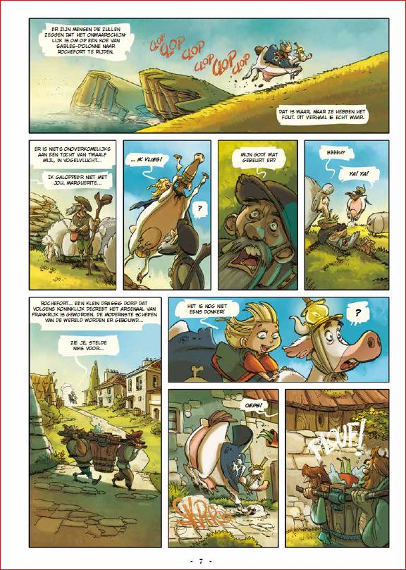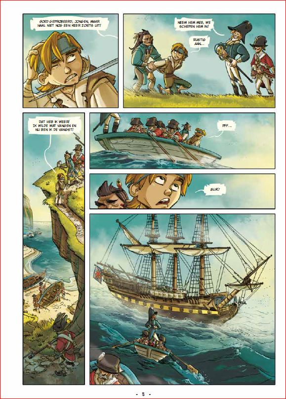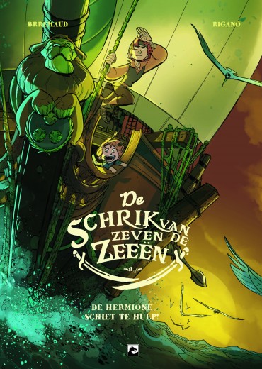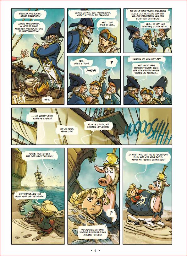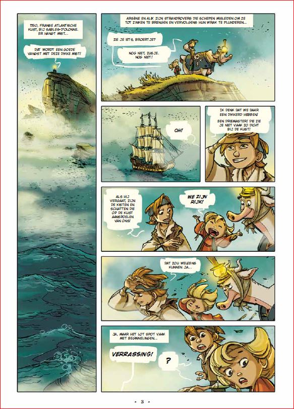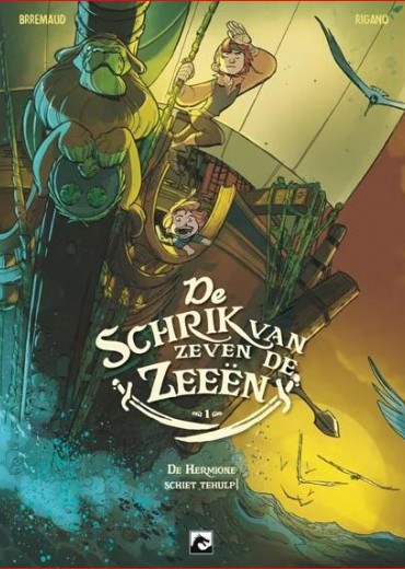 Score moyen 3 / 5Als je de titel voor het eerst hoort, doet het je meteen denken aan dat andere piratenverhaal ‘De duivel der zeven zeeën’. Maar dit album heeft er hoegenaamd niets mee te maken. Het verhaal vangt op Franse bodem in 1780 aan als Arsène en Alix, broer en zus, het zoveelste schip proberen te lokken in de mist en het doen vastlopen op de kliffen. Dit loopt echter verkeerd af en ze worden ontmaskerd door een Engelse vloot. Alix weet zich te redden op haar koe (met piratenvlag), maar Arsène wordt gevangen genomen en meegevoerd richting het Engelse vasteland. Alix besluit haar oudere broer Germain op te zoeken, die net scheepsarts geworden is (maar het als oplichter dus niet is) op een Frans schip die richting Amerika vaart. Door middel van hypnose weet Germain echter de kapitein te overtuigen om het Engelse schip aan te vallen en hun broer Arsène terug te brengen. Intussen zijn de Engelsen te weet gekomen waar de schat van de Conquistadores gelegen is… Kunnen de Fransen de Engelsen bijbenen en hen overmeesteren ? En weet Arsène zich intussen te redden op het Engelse schip ? Je merkt het al een beetje, humor is alom aanwezig in dit album. Scenarist met de opvallende naam Brrémaud (Sprietje, Twee jaar vakantie, Hercule Poirot,…) weet er leuke elementen in te brengen. Wat dacht je van een vliegende koe (of toch niet), een kat die liever lui is dan moe, Alix die de kapitein zijn verrekijker aftroeft,… Dit gaat meestal gepaard met een verhaal die geen hoge toppen scheert, wat in dit geval van toepassing is. De insteek is leuk, maar op zich komt het er in dit eerste deel op neer dat broer en zus hun andere gekidnapte broer willen redden. De tekeningen zijn getekend door Giovanni Rigano (Pirates of the Carribean, Artemis Fowl,…) en passen bij dit verhaal. Ze zijn wat minder volwassen opgevat waarbij volop gewerkt wordt met de ogen en de monden om de vele expressies naar voren te brengen. Dit komt goed en leuk over en daarbij wordt niet overdreven, dus dit is zeker geslaagd. Ook de inkleuring is kleurrijk voorzien wat bijdraagt tot de losse sfeer. We worden tegenwoordig verwend op het vlak van piraten albums, denk maar onder andere aan ‘Het Piratenrijk’ en ‘De verborgen Haven’. Dit tweeluik is echter opgevat als een humoristische afwisseling op de vele serieuzere piratenverhalen. Ben je op zoek naar een luchtige strip om je te amuseren op een warme zomeravond, dan is dit de ideale lectuur.