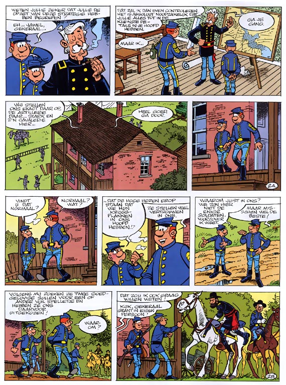 De reeks 'De Blauwbloezen' is een geslaagde mengeling van avontuur en humor. Cauvin gebruikt - zoals hij wel meer doet - historische anekdotes uit de Amerikaanse burgeroorlog om ons hilarische verhalen te vertellen over de perikelen in het leger, waar de hoogste officieren niet per se de slimste zijn... Willy Lambil heeft zich uitstekend gedocumenteerd en maakt van zijn pagina's heldere, intelligente kunstwerkjes. Het resultaat is amusement op hoog niveau, dat door een nog steeds groeiend publiek wordt gewaardeerd.