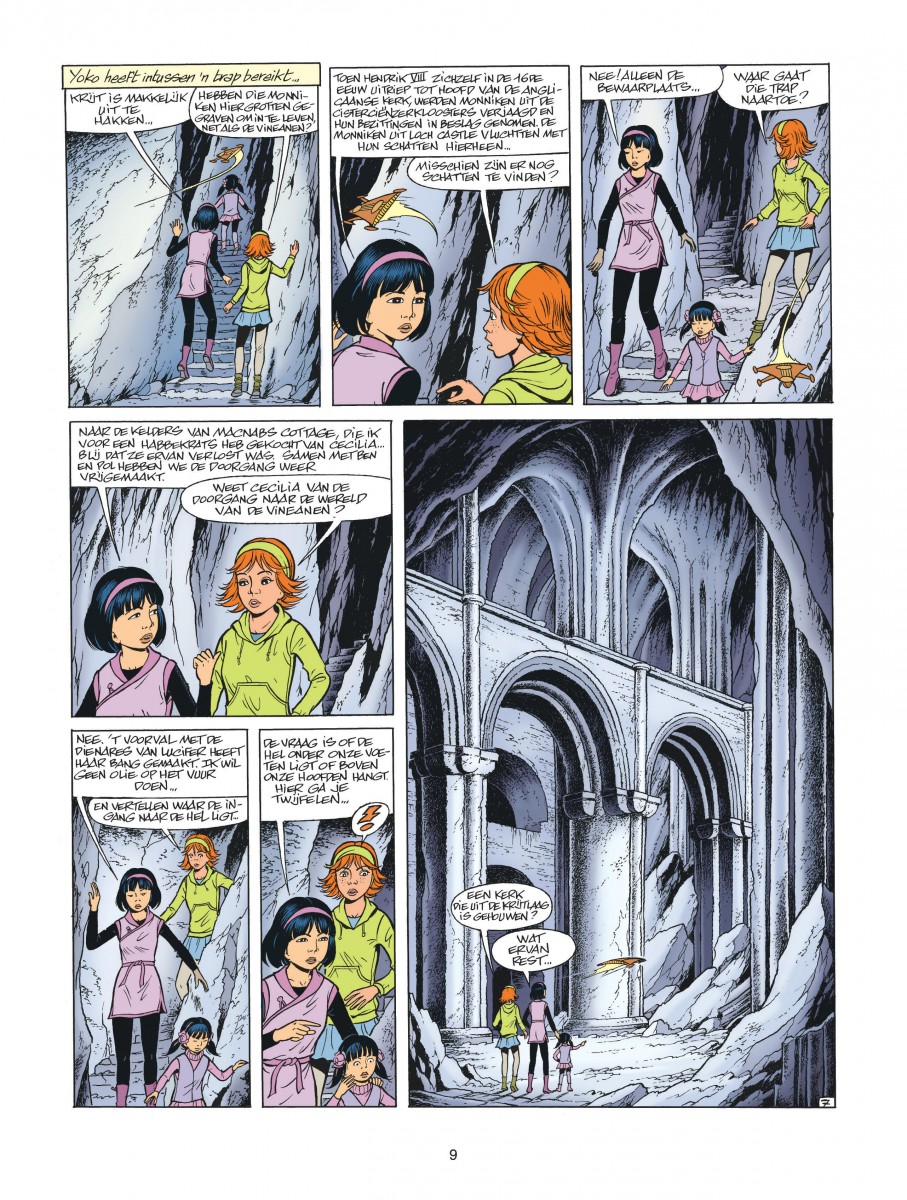 Yoko krijgt een bericht van Khany die haar hulp inroept. Samen met Emilia snelt ze naar Loch Castle, niet naar de cottage maar naar de restanten van een middeleeuws kasteel. Daar ontdekken ze een krijtgrot waar cisterciënzer monniken in de vijftiende eeuw een klooster hebben ingericht. Ze stuiten er op Lathy die hen vertelt dat Zarka, de dienares van Lucifer, wil dat Yoko haar vervoegt. Maar ook Khany zit in de rats: uit vrees ontdekt te worden, leidt ze de Vineanen steeds verder weg onder het aardoppervlak, tot diep in de grot waar Zarkâ de plak zwaait ... Maar hoe daar geraken? Misschien kan Yokoís nieuwe vriendin Isolde de weg tonen? Roger Leloup: 83 jaar intussen, ooit begonnen als medewerkers van Hergé en Peyo. Een van de bestverkopende klassieke reeksen ooit: meer dan 7,5 miljoen exemplaren wereldwijd.