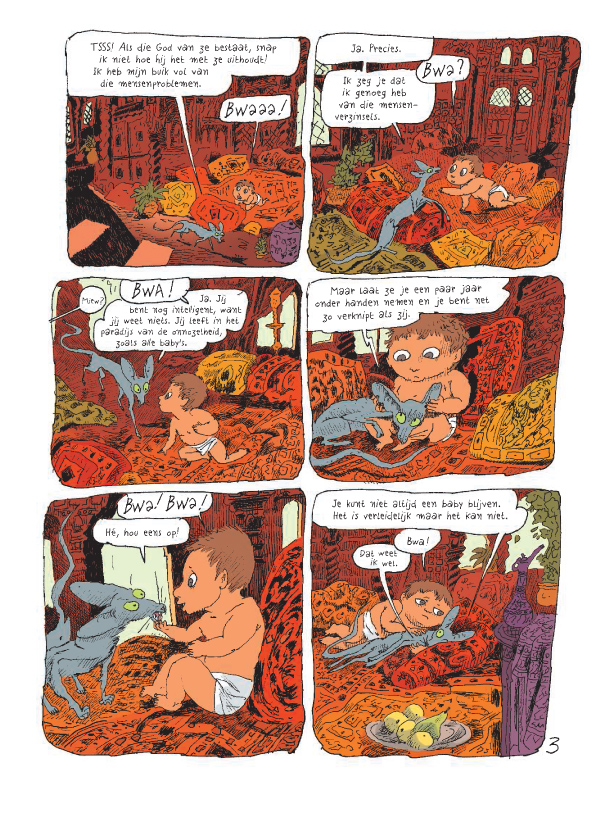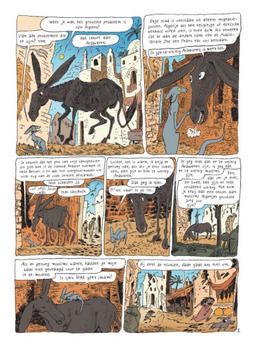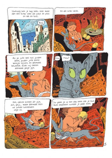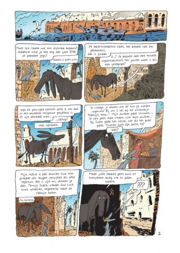 Deze nieuwe episode brengt ons naar Algiers. Rabbijn Sfar en zijn neef imam Sfar keuvelen over hun verschillende opvattingen. Die lijken hen onverzoenbaar. En toch: wanneer de moskee onderloopt zijn de rabbijn en de imam het wondersnel eens dat de moslims tijdens de herstellingswerken in de synagoge mogen komen bidden. Intussen beleeft de kat van de rabbijn moeilijke tijden: de baby van Zlabya is een dotje en gaat met alle aandacht lopen. En alsof dat nog niet genoeg is, hebben vreemde kittens zich in de synagoge verstopt ... Waar halen ze het lef om zijn melk op te drinken? Stripreeks over een filosoferende kat. Hoewel de reeks de grote thema's niet schuwt, blijft het lichtvoetig en amusant. Sfar is een fenomeen: filmmaker, romancier, striptekenaar en -scenarist, muzikant, ... Winnaar van ontelbare prijzen en Ridder in de Franse Orde van Kunsten en Letteren.
