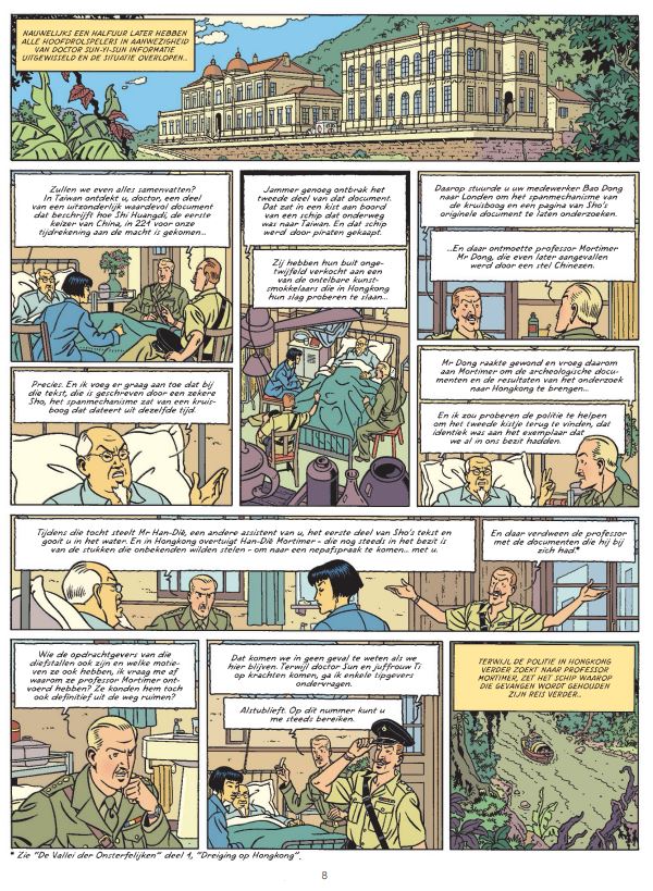 In Lhassa heeft een eskader Zwaardvissen het keizerlijk paleis van dictator Basam-Damdu platgegooid. De wereld haalt weer opgelucht adem en viert het einde van de Derde Wereldoorlog. Maar in het naburige China komen de communisten van Mao in opstand tegen de nationalisten van Chiang Kai-Shek. Krijgsheer Xi-Li weet de hand te leggen op geschriften die hem de macht over het Midden-Rijk toeschrijven. Om de dreiging voor de regio af te wenden krijgt kapitein Francis Blake de opdracht om de Britse kolonie van Hongkong in stelling te brengen voor een eventuele aanval. In Londen raakt professor Philip Mortimer geïntrigeerd door een archeologische vondst uit China die ook heel wat interesse en afgunst wekt van buitenstaanders. De beruchte kolonel Olrik - door Basam-Damdu bedankt voor zijn diensten als militair raadgever - zint dan weer op wraak. Hij maakt gebruik van de chaos en biedt generaal Xi-Li zijn diensten aan ... Primeur: quatre-mains van twee Nederlandse tekenaars. Peter van Dongen ontving in 2018 de Stripschapprijs voor Rampokan (Vrije Vlucht). Teun Berserik is een illustrator en striptekenaar van de graphic novel Vincent Van Gogh, De vroege jaren. Eerste deel van een nieuw tweeluik. Het verhaal pikt de draad op precies daar waar Het Geheim van de Zwaardvis (1950) eindigde. Scenario van Yves Sente mixt avontuur en sciencefiction: van het exotische Hongkong tot het Londen dat we kennen uit Het Gele Teken.