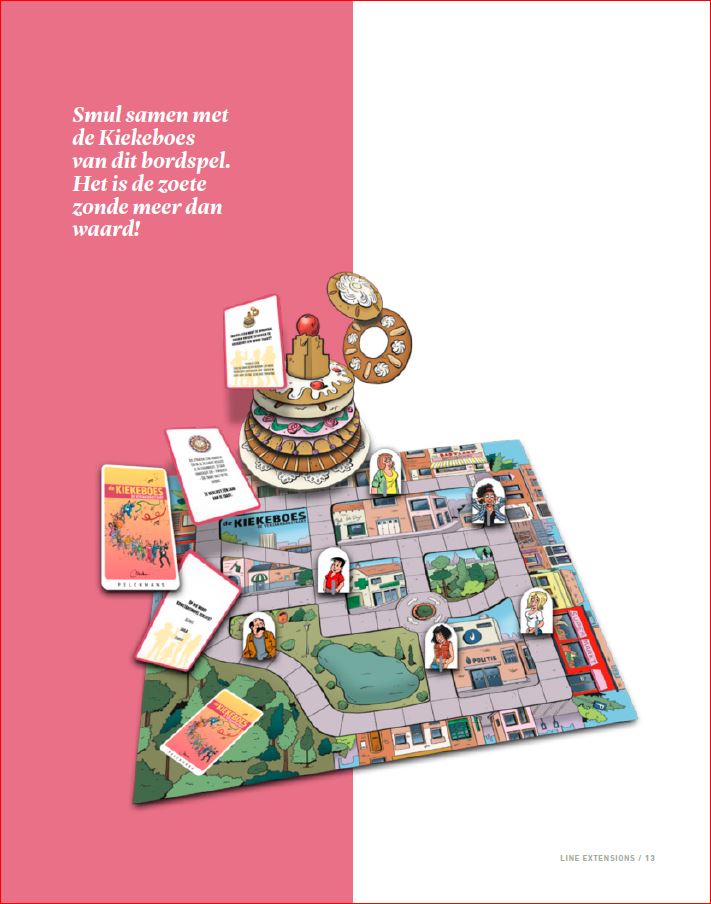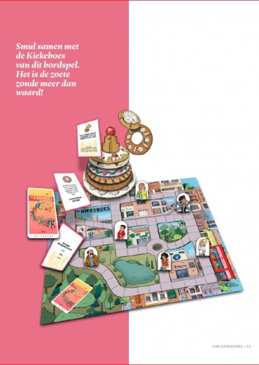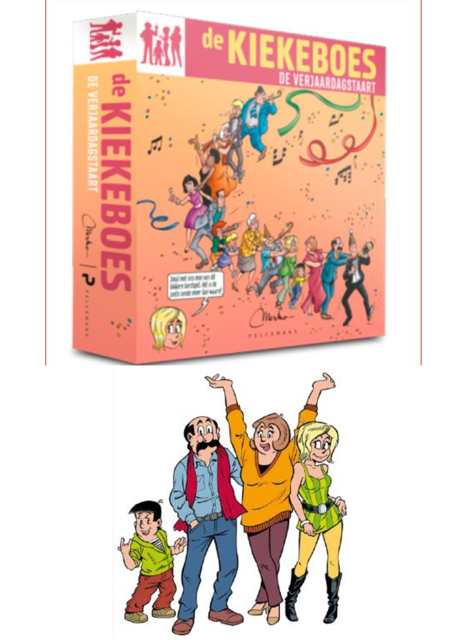 2 TOT 6 SPELERS VERPAKKING MET SPELBORD, 6 PIONNEN, 2 DOBBELSTENEN, 300 SPEELKAARTEN, 6 VERJAARDAGSTAARTEN EN HANDLEIDING 25 X 25 X 5 CM De Kiekeboes DE VERJAARDAGSTAART met illustraties van Merho vanaf 8 jaar Het verjaardagsfeest van Fanny dreigt in het honderd te lo- pen, omdat iedereen vergeten is om de taart op te halen bij Bakkerij Bastaart. Wat een flater! De Kiekeboes moeten hun beste beentje voorzetten om van Fanny’s verjaardag toch een succes te maken en de taart tijdig op het feest te krijgen. Zal het hen lukken en kan Fanny ongestoord vie- ren? Of moet ze haar eigen verjaardag redden en de taart zelf ophalen? De Kiekeboes rennen van hot naar her door het dorp. Door de vragen, raadsels en puzzels die op hun pad ko- men op te lossen, kunnen ze telkens een stukje van de taart verdienen. Maar er liggen natuurlijk ook gevaren op de loer! Wie als eerste de volledige taart weet te verzame- len, redt het feest en wint het spel. De verjaardagstaart is een bordspel in de alom bekende stijl van De Kiekeboes. Rond het spelbord is plaats voor twee tot zes zoetekauwen vanaf 8 jaar. De gemiddelde speelduur bedraagt 45 minuten. Maar als dat niet vol- doende voor je is, kun je het spel steeds opnieuw spelen. Op één been kun je niet staan en dat geldt ook voor taart, toch?!