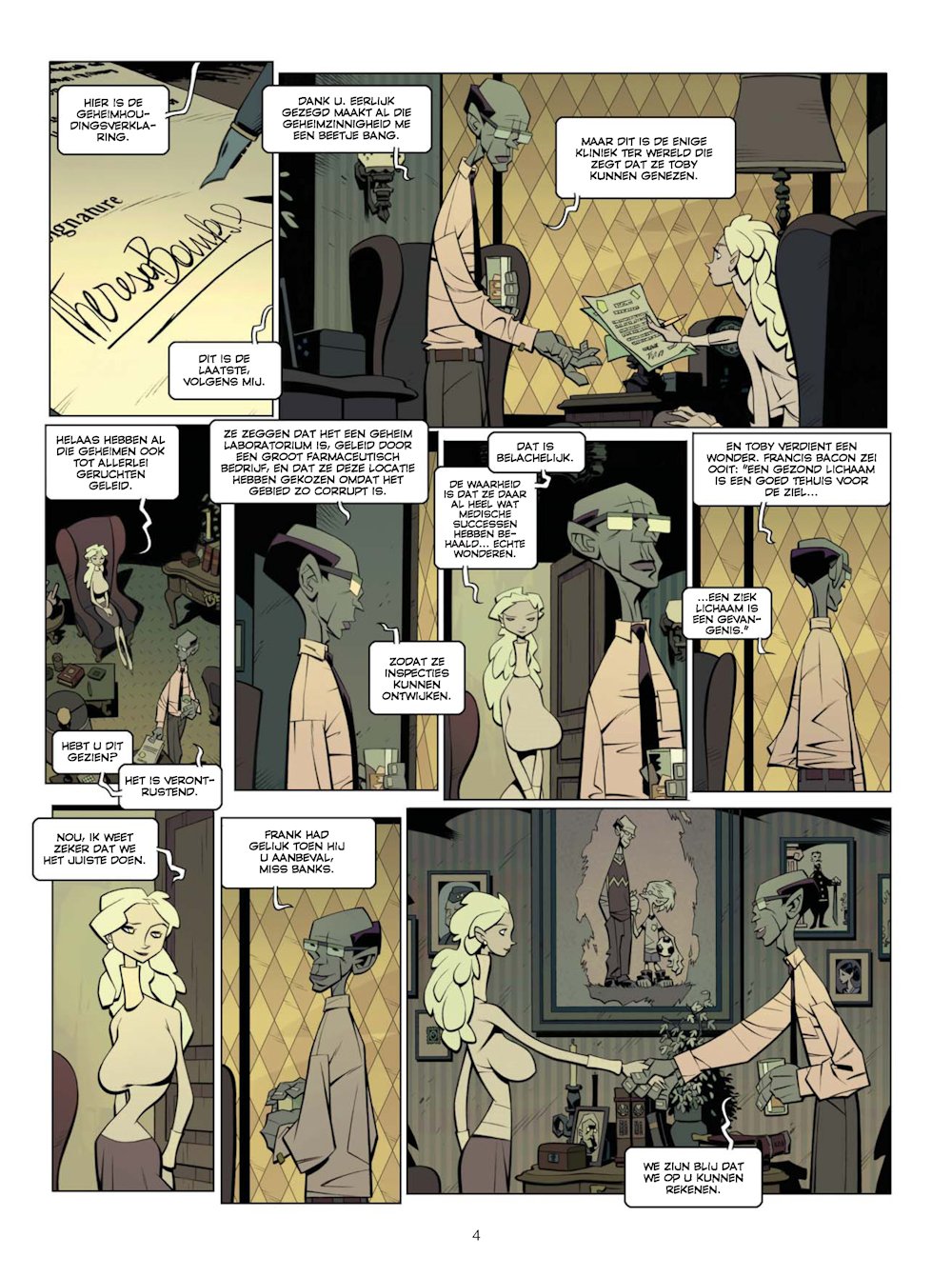 Theresa, een prachtige jonge verpleegster, begeleidt de jonge Toby, misvormd en aan een rolstoel gekluisterd, naar de enige kliniek ter wereld die beweert hem te kunnen helpen. Zijn vader maakt zich zorgen over de vele vreemde geruchten die de ronde doen over deze kliniek – maar dat zijn maar geruchten, toch? Vanaf het moment echter dat Theresa en Toby er binnenkomen, groeien de geheimzinnigheid en de argwaan. Het slachtoffer van een auto-ongeluk wordt geweigerd tot Theresa tussenbeide komt; gigantische gemuteerde patiënten zwerven door de gangen; een verwilderde man met een geweer beweert dat er patiënten in de kelder verborgen zitten; en dan is er nog de vreemde, stomme verpleegster die met telepathische krachten de kliniek bestuurt. Wat is hier precies gaande? Waarom krijgt Theresa nergens een direct antwoord op? Kan deze bizarre plek Toby genezen? Worden ze hier beide gevangen gehouden - of misschien nog erger ... ? 'De verpleegster' is een duistere, verontrustende reis naar plekken waar je niet van durfde te dromen ... behalve in nachtmerries.