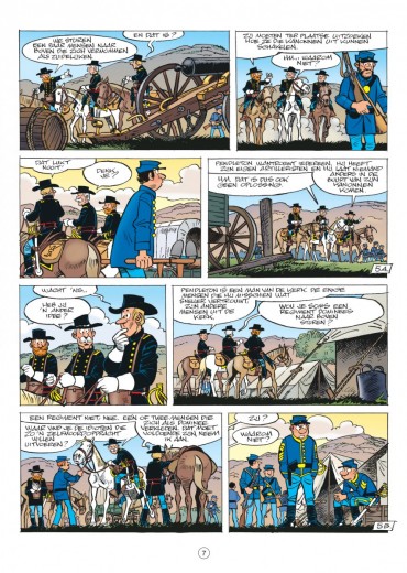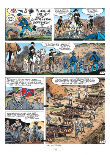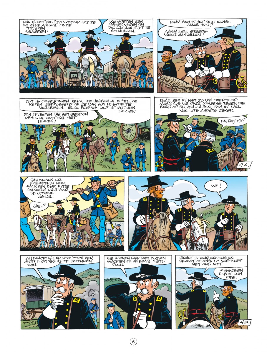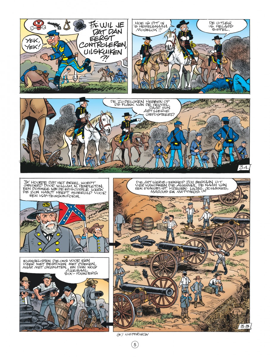 De Blauwbloezen worden geconfronteerd met een vervelend probleem. Ze worden in hun opmars gestuit door commandant William N. Pendleton, die in een vorig leven dominee was maar nu de troepen van kapitein Stark van op een heuveltop onder vuur neemt met vier kanonnen (die hij de namen van de vier evangelisten gegeven heeft). Als de kapitein nog een deel van zijn troepen wil sparen, moet hij dringend een list bedenken om Pendleton te neutraliseren. Een opdracht die op het lijf geschreven lijkt van sergeant Chesterfield en korporaal Blutch. Zij worden eropuit gestuurd om de kanonnen te saboteren. Makkelijker gezegd dan gedaan, want commandant Pendleton duldt geen bezoek en al zeker geen pottenkijkers. Maar wil hij misschien wel een 'collega' ontvangen? Chesterfield verkleedt zich als geestelijke en neemt een dorpsidioot mee (Blutch zal proberen de kanonnen te saboteren) over wie hij zich als goede christen heeft ontfermd. Verder kunnen we nog maar één ding doen: een schietgebedje prevelen en hopen dat alles goed gaat. Zoals altijd belichten Cauvin en Lambil ook nu weer een historisch feit dat ze op hun typische manier verwerken tot een hilarisch album.