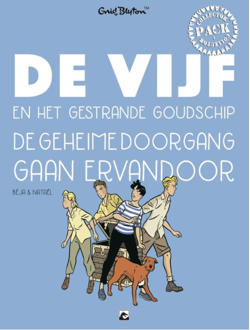 Verwacht maart 2024 De boeken gaan over de broers Julian en Dick, hun zusje Annie en hun nichtje Georgina (George). Het vijfde groepslid is de bastaardhond van George, Timmy. De kinderen zitten allemaal op een kostschool (uiteraard, gezien de tijd waarin de verhalen zich afspelen, zitten de jongens op een jongenskostschool en de meisjes op een meisjeskostschool). In de kostschool waar George en Annie op zitten zijn huisdieren toegestaan, waardoor George Timmy mee kan nemen. Als dat niet zou mogen, zou George nooit op een kostschool willen zitten. In de schoolvakanties komen ze altijd bij elkaar en beleven dan avonturen die zich vaak rondom Kirrin, de woonplaats van Georges ouders, afspelen. 3delen De Vijf en het gestrande goudschip De Vijf en de geheime doorgang De Vijf gaan ervandoor