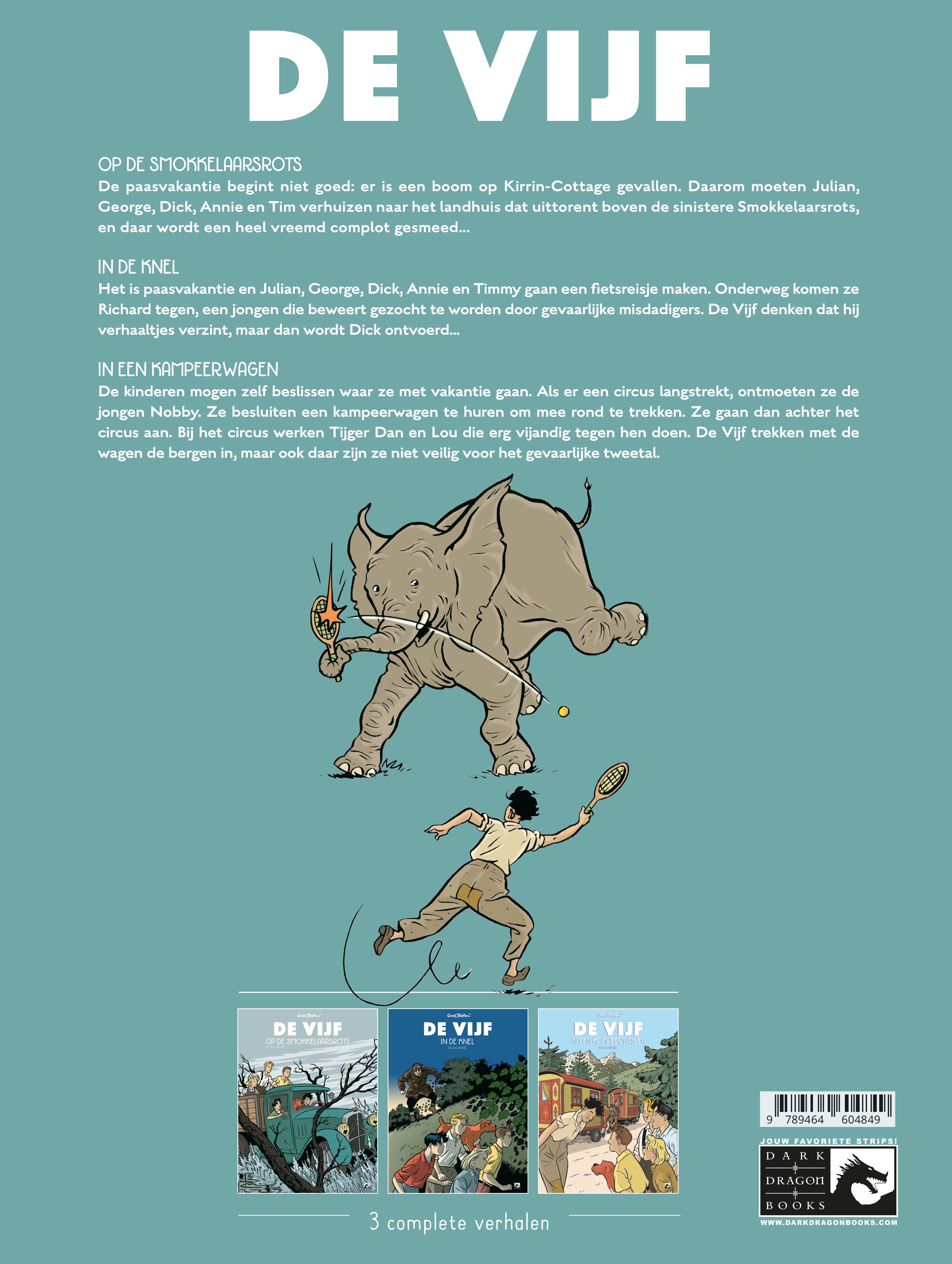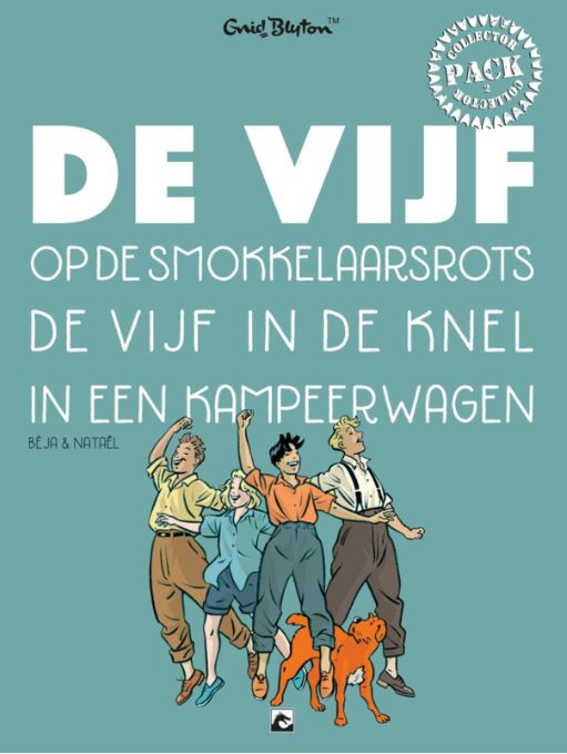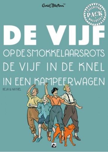 Verwacht maart 2024 De boeken gaan over de broers Julian en Dick, hun zusje Annie en hun nichtje Georgina (George). Het vijfde groepslid is de bastaardhond van George, Timmy. De kinderen zitten allemaal op een kostschool (uiteraard, gezien de tijd waarin de verhalen zich afspelen, zitten de jongens op een jongenskostschool en de meisjes op een meisjeskostschool). In de kostschool waar George en Annie op zitten zijn huisdieren toegestaan, waardoor George Timmy mee kan nemen. Als dat niet zou mogen, zou George nooit op een kostschool willen zitten. In de schoolvakanties komen ze altijd bij elkaar en beleven dan avonturen die zich vaak rondom Kirrin, de woonplaats van Georges ouders, afspelen. 3 delen De Vijf op de smokkelaarsrots De Vijf in een kampeerwagen De Vijf in de knel