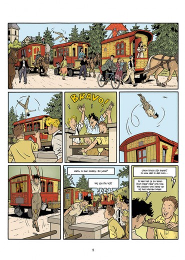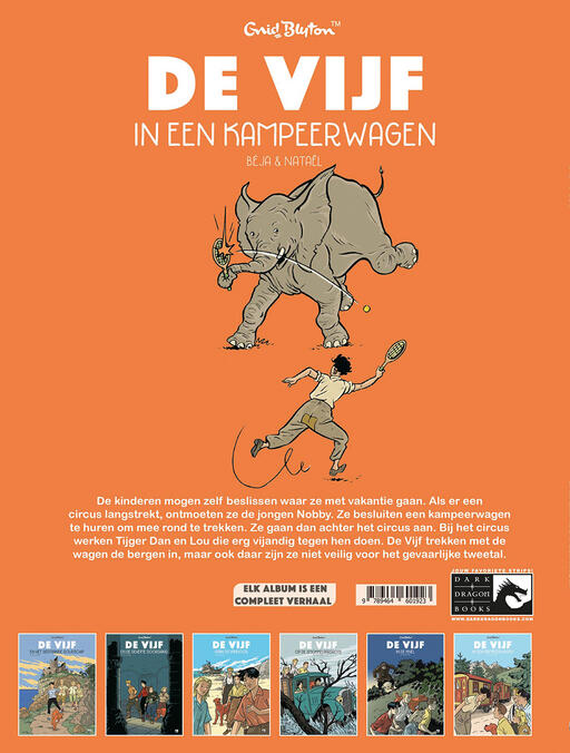 ‘Ze zwaaien allebei met een rode doek, niet met een witte. Rood staat voor gevaar. Hij waarschuwt ons!’ Als Julian, Dick, Anne, George en Timmy met twee kampeerwagens op vakantie gaan, ontmoeten ze Nobby, een jongen die met zijn circus in de buurt kampeert. Ze sluiten vriendschap met hem en zijn chimpansee Pongo. Twee van de circusartiesten zijn echter niet zo blij met de aanwezigheid van De Vijf ...