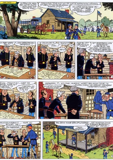 De reeks 'De Blauwbloezen' is een geslaagde mengeling van avontuur en humor. Cauvin gebruikt - zoals hij wel meer doet - historische anekdotes uit de Amerikaanse burgeroorlog om ons hilarische verhalen te vertellen over de perikelen in het leger, waar de hoogste officieren niet per se de slimste zijn... Willy Lambil heeft zich uitstekend gedocumenteerd en maakt van zijn pagina's heldere, intelligente kunstwerkjes. Het resultaat is amusement op hoog niveau, dat door een nog steeds groeiend publiek wordt gewaardeerd.