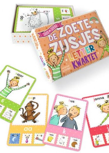 Een spelletje kwartet verveelt nooit! Vooral niet als je het vrolijke 'Zoete Zusjes letterkwartet' mag spelen met de bekende illustraties van Iris Boter. Zoek de kwartetten bij elkaar, en winnen maar! Dit gezellige kwartet van Zoete Zusjes Saar en Janna is voor kleuters die het leuk vinden om met letters bezig te zijn. Zo kunnen ze thuis spelenderwijs oefenen met letters en woordjes. Dit kwartetspel kan met letters en woorden gespeeld worden, maar ook met de plaatjes en op kleur en is dus geschikt voor kinderen vanaf 4 jaar. De 32 stevige kaartjes (8 kwartetten) met afbeeldingen van de Zoete Zusjes zitten in een mooie bewaardoos en zijn bedacht door Hanneke de Zoete. Leerdoelen: • Herkennen en oefenen met letters • Koppelen van klanken aan letters • Onderscheiden van klanken in woorden