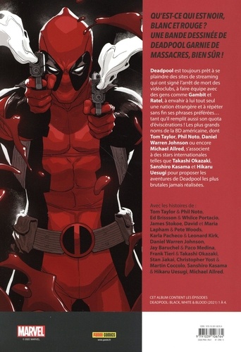 Deadpool est toujours prêt à se plaindre des sites de streaming qui ont signé l'arrêt de mort des vidéoclubs, à faire équipe avec des gens comme Gambit et Ratel, à envahir à lui tout seul une nation étrangère et à répéter sans fin ses phrases préférées... tant qu'il remplit aussi son quota d'éviscérations ! Les plus grands noms de la BD américaine, dont Tom Taylor, Phil Noto, Daniel Warren Johnson ou encore Michael Allred, s'associent à des stars internationales telles que Takashi Okazaki, Sanshiro Kasama et Hikaru Uesugi pour proposer les aventures de Deadpool les plus brutales jamais réalisées.