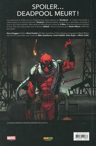 Adieu Deadpool... place à Zenpool ! Au cours de l'évènement Axis, Wade Wilson a été envoûté par un sortilège qui inverse la personnalité et la philosophie des gens : le voici devenu un mercenaire pacifiste ! Pas sûr que son épouse Shiklah, démone de son état, apprécie le changement ! Avec cet album, la première série Deadpool signée Gerry Duggan arrive à son terme mais soyez rassurés, ce n'est que le début du voyage ! Trois albums supplémentaires seront consacrés à la série All-New Deadpool, qui bouclera pour de bon la période la plus marquante du Mercenaire Disert.