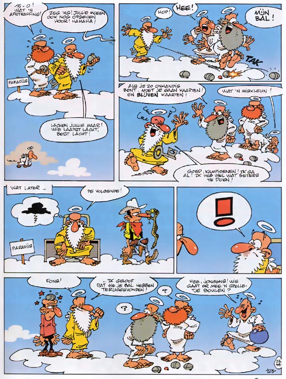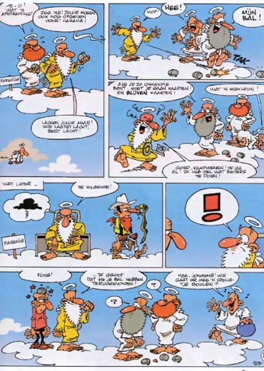 'Ja, vadertje zweeft langs den Hemel, buig eventjes de knietjes, kom! En laat ons bidden, Lieve Heertje, breng onze papa gauw weerom! Wat 'n vreugd als pappie thuis kwam, met cadeautjes o zo fraai. Mooie sarongs, een klein aapje, en nog laatst een papegaai...' Misschien ken je het kinderliedje nog. Ook Sint-Pieter is zo'n beetje een tweede vader voor ons allemaal. Een aardige man die zijn best doet voor iedereen. Want er is een paradijs voor elk van ons. Voor de vliegen, de dennenbomen, de koeien. Maar kijk uit als je het té bont hebt gemaakt. Dan vlieg je onverbiddelijk richting hel.