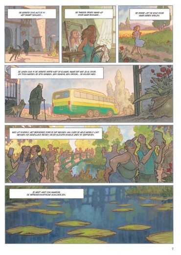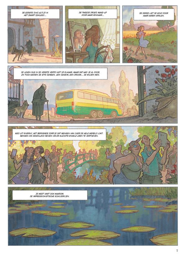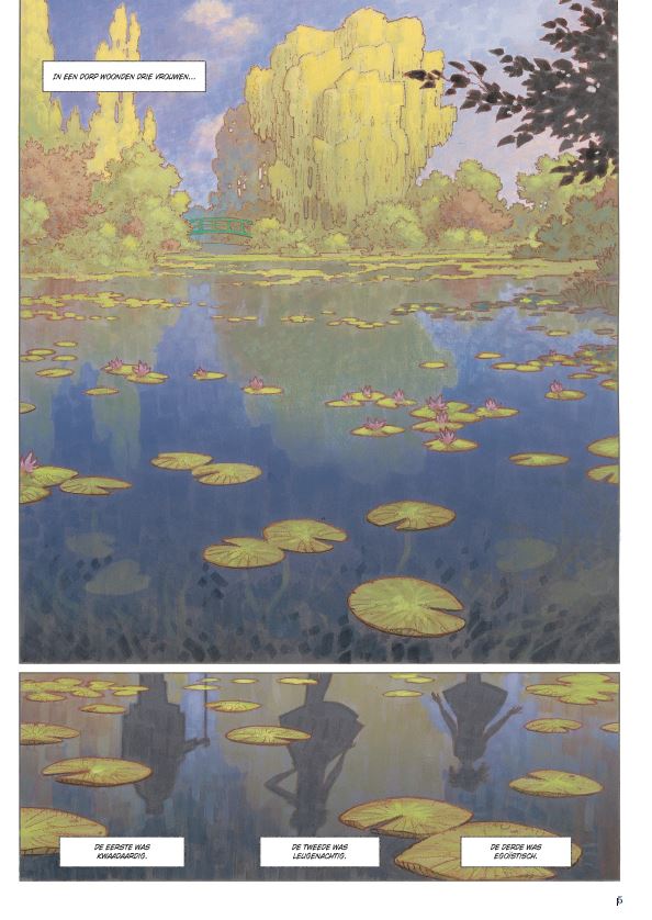 ZWARTE WATERLELIES (Cassegrain/Duval naar Michel Bussi) Michel Bussi (1965; FRA) schreef gelukkig voor ons een heel aantal boeiende boeken. Na het lezen van 'Zwarte Waterlelies' (2020) en 'Ogen zo Blauw' (2022) kunnen we alleen maar hopen dat scenarist Fred Duval ook nog andere titels verstript. Giverny is vooral bekend als woonplaats van de impressionistische schilder Claude Monet (1840-1926). Zijn schilderijen van de vijver met waterlelies behoren tot zijn bekendste werken. Onze 'impressie' na het lezen van dit album is er één van opperste bewondering. Drie vrouwen (meisjes) spelen een hoofdrol. Alle drie willen ze blijkbaar ontsnappen uit dit lieftallige dorpje. Voor de oudste - een (bijna) weduwe van plus 80 - kan je moeilijk sympathie opbrengen. Voor Stéphanie Dupain - onderwijzeres; 36 jaar - wil je gerust wat meer tijd nemen! En Fanette Morelle - 11 jaar - krijgt aandacht van alle jongens van haar school. Maar dan gebeurt er plots een moord op de rijke oogarts van het dorp, Jerôme Morval. Met de vrouwtjes had die al heel wat avontuurtjes beleefd. Inspecteur Laurenç en adjunct Sylvio starten een moeilijk onderzoek. De drie vrouwen zetten ons regelmatig op het verkeerde been en de inspecteur heeft meer dan een gezonde interesse voor de bloedmooie Stéphanie. Maar hou je klaar voor de geweldige plottwist op het einde van dit verhaal! Wedden dat je dadelijk een tweede leesbeurt aanvat! Didier Cassegrain (Valstrik op Zorkass, Legenden van Troy, Conan) heeft de sfeer van Monet grandioos in zijn tekeningen verwerkt. Van een impressie gesproken! Mensen en hun relaties, het zal ons altijd blijven boeien.