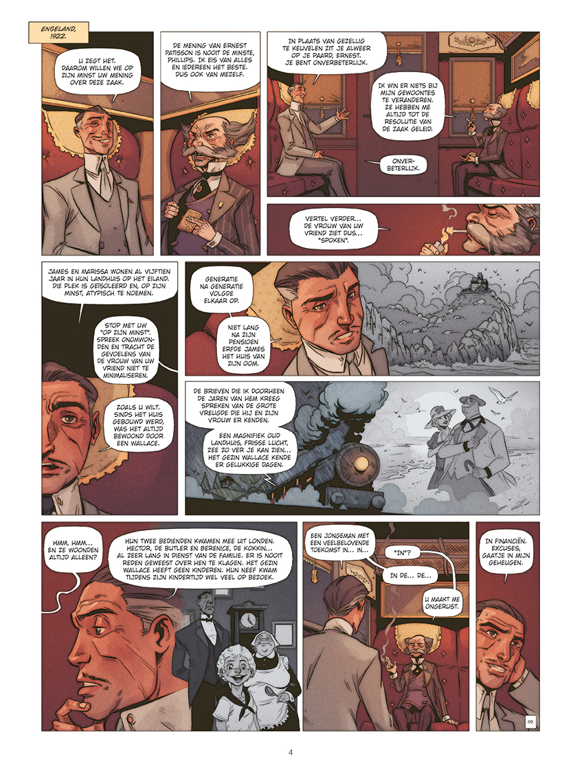 Deze reeks vertelt de avonturen van de respectievelijke figuren, detectives uit de strip 1. Zeven Detectives Ernest Patisson wordt uitgenodigd op een afgelegen landgoed op een Schots eiland. De heer van het huis zou graag de mening van de detective hebben over een gluiperige geest die zijn vrouw lijkt te achtervolgen. Patisson beantwoordt de vreemde uitnodiging met plezier. Als eeuwig sceptische rebel kan hij niet wachten het mysterie op te lossen. Maar afgezonderd op het eiland, waar deuren uit zichzelf dichtslaan en geschreeuw echoot in de nacht, is het moeilijk om het hoofd koel te houden ...