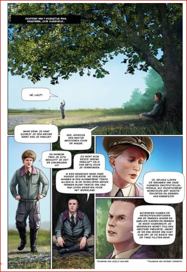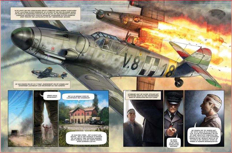 Une histoire complètement terminée en un seul album. Gyula Pozsgay s'est fait un nom avec l'album The Old Tiger (DDB). Les amateurs de Romain Hugault (Angel Wings) se délecteront du style pictural et des avions détaillés. À la périphérie de Sopron, en Hongrie, se trouve un cimetière rempli de héros. Là se trouve un monument particulier. Une pierre tombale ornée d'une hélice tordue, provenant d'un avion abattu pendant la Seconde Guerre mondiale. Ici repose un jeune homme avec sa famille. Son nom est László Molnár ; jusqu'à sa mort, il était le pilote de combat le plus efficace de Hongrie. Son surnom était LION. Voici son histoire...
