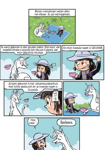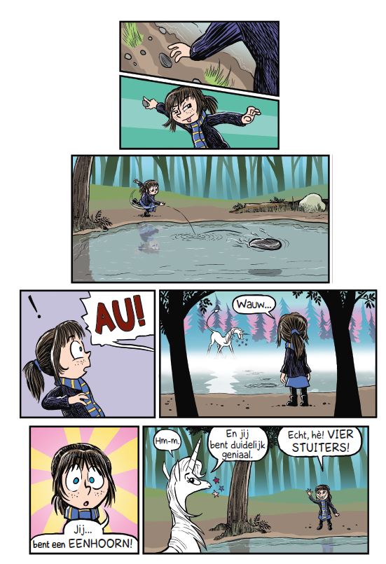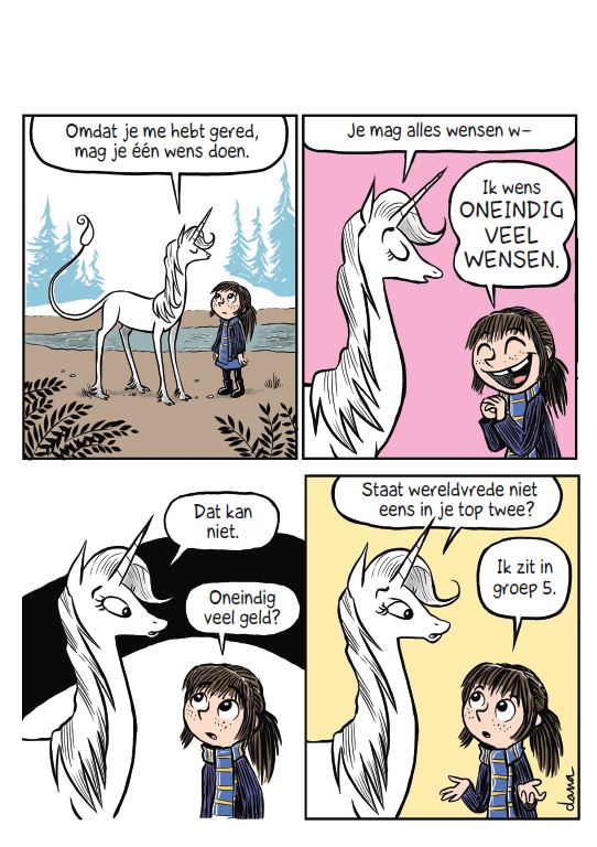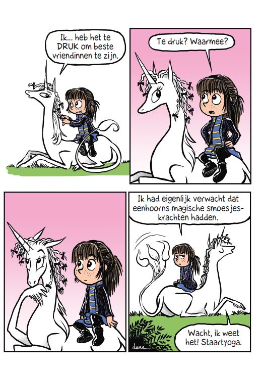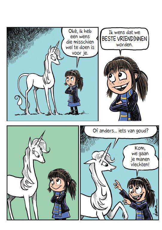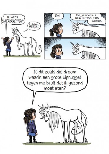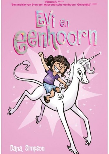 Evi en eenhoorn is het eerste deel in de hilarische graphicnovelserie van Dana Simpson. Volledig in kleur, voor meisjes vanaf 8 jaar. serie is smullen voor heel veel leeftijden. Calvin & Hobbes, als Calvin een meisje van 9 was en Hobbes een eenhoorn.... Evi en eenhoorn is het eerste deel in de hilarische graphicnovelserie van Dana Simpson.Volledig in kleur, voor meisjes vanaf 8 jaar..... Evi verveelt zich en ketst steentjes over het water. Tot er een steen tegen een eenhoorn ketst. En Evi een wens mag doen. En ze wenst dat de eenhoorn in kwestie haar bestie wordt. Dus laveert Evi nu door alle basisschoolproblemen met een eenhoorn aan haar zijde. Niks mis met een beetje narcisme en hooghartigheid op zijn tijd als dat betekent dat je beste vrienden bent met een eenhoorn. Toch?