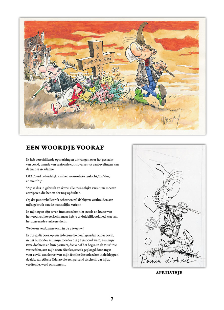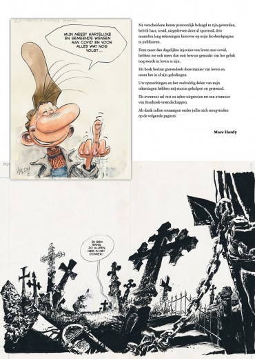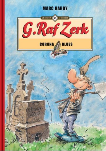 'Net zoals iedereen werd Marc Hardy de voorbije twee jaar dagelijks geconfronteerd met de nieuwsgeving, opnievorming en gevolgen van het coronavirus op onze samenleving, op zichzelf en zijn geliefden. Net zoals iedereen, probeerde hij dit maatschappelijk drama op zijn eigen manier een plaats te geven, een poging om als het ware covid uit te drijven... En hoe kan een auteur, een striptekenaar, dit beter doen door zijn gevoelens en gedachten hierover op papier neer te zetten en meer zelfs, door deze tekeningen drie maanden lang op zijn Facebookpagina te delen met zijn volgers. Corona Blues is dus niet zo maar een album van G. Raf Zerk, het is zowel een impressie over drie maanden uit de pandemie, als een avontuur van Facebookvriendschappen. In dit atypische G. Raf Zerk-album moet de grafelver met de bruine pet en het grote reukorgaan de hoofdrol delen met de twijfelachtige Covid-19, die als een rode draad doorheen het album loopt, of eerder sluipt. 64 pagina’s lang vinden we G. Raf Zerk terug in zijn vertrouwde habitat, het kerkhof, waar zowel levenden als doden elkaar kruisen en waar de dood als de dood blijkt te zijn voor de Covid-19... Marc Hardy is al meer dan twintig jaar een van de vaste waarden bij vzw Arcadia. Het begon in 2000 met Gordh, het eerste deel uit de reeks Arkel, rond de lotgevallen van de gelijknamige leidsengel. In 2013 mochten we met Youkaïdi kennismaken met De Libellenpatroelje, en in 2022 verwelkomen we de sympathieke grafdelver, G. Raf Zerk, zonder meer de meest succesvolle serie van de Luikse auteur, die een groot deel van zijn carrière samenwerkte met de inmiddels betreurde Raoul Cauvin, gekend van De Blauwbloezen, Cupido, Agent 212 en andere reeksen. Dit album bevat ook enkele hommagecartoons aan Cauvin.'( bron ssz) gelimiteerde hardcover