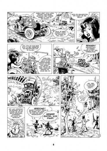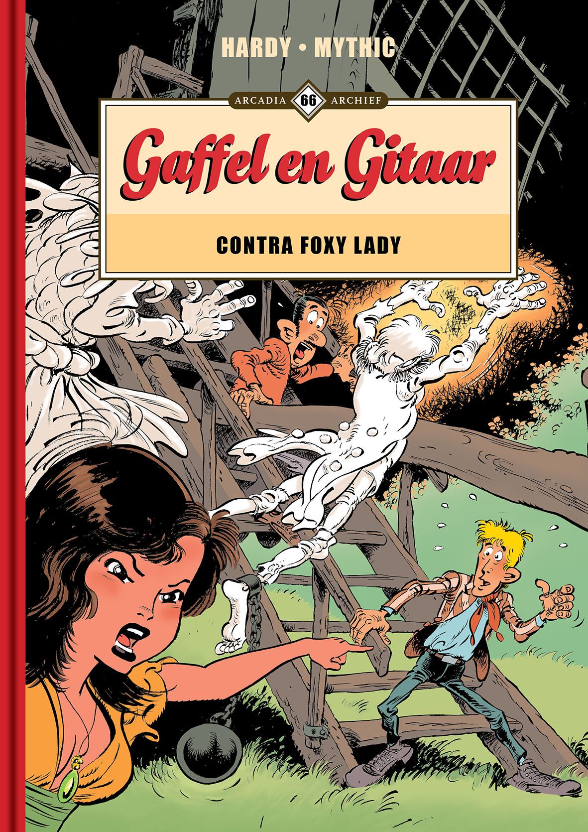 GAFFEL EN GITAAR - CONTRA FOXY LADY Twee politieagenten, een van wanten wetende dievegge en een uit de kluiten gewassen gorilla kruiden de avonturen van Gaffel en Gitaar. Deze komische politiereeks met fantastische inslag verscheen voor het eerst ten tonele in 1975 in Robbedoes, en zou nog tot 1978 te volgen zijn in het populaire weekblad. Voor de striplezer betekende de reeks één van de eerste kennismakingen met tekenaar Marc Hardy, die enkele jaren later zijn grote doorbraak kende met de lotgevallen van grafdelver G. Raf Zerk.Het scenario is van Mythic (Jean-Claude Smit-le-Bénédicte - bekend van oa. Alfa en Rubine). Opblaasbare poppen, een bataljon spoken, een toverfluit waarop de rattenvanger van Hamelen zelfs jaloers zou zijn en slaapgas; niets is te gek voor Foxy Lady om haar doel te bereiken en de lange arm der wet telkens weer opnieuw op het verkeerde been te zetten? Althans, dat is zonder Gaffel en Gitaar gerekend, die nooit ver weg zijn om de sexy dievegge stokken in de wielen te steken en de vergaarde buit weer aan haar rechtmatige eigenaars terug te bezorgen.
