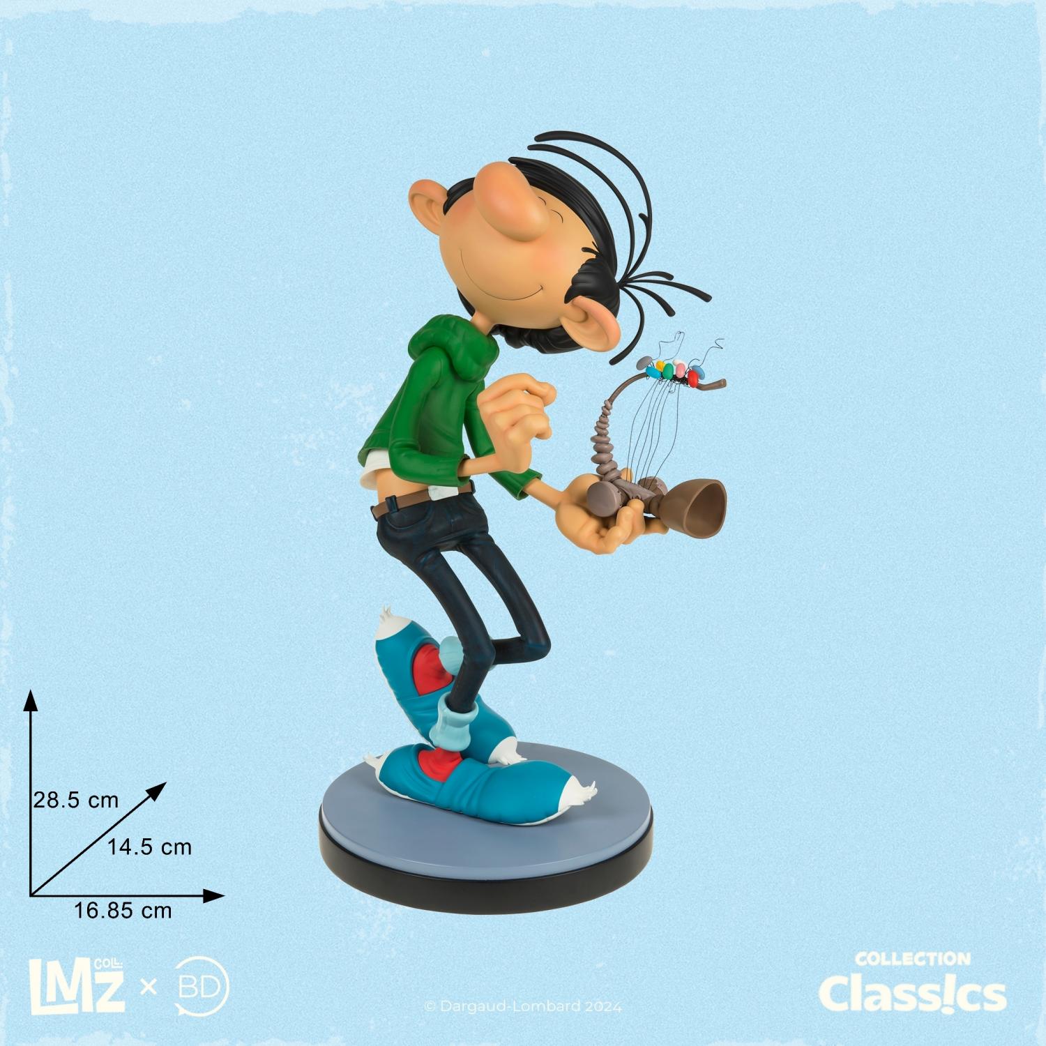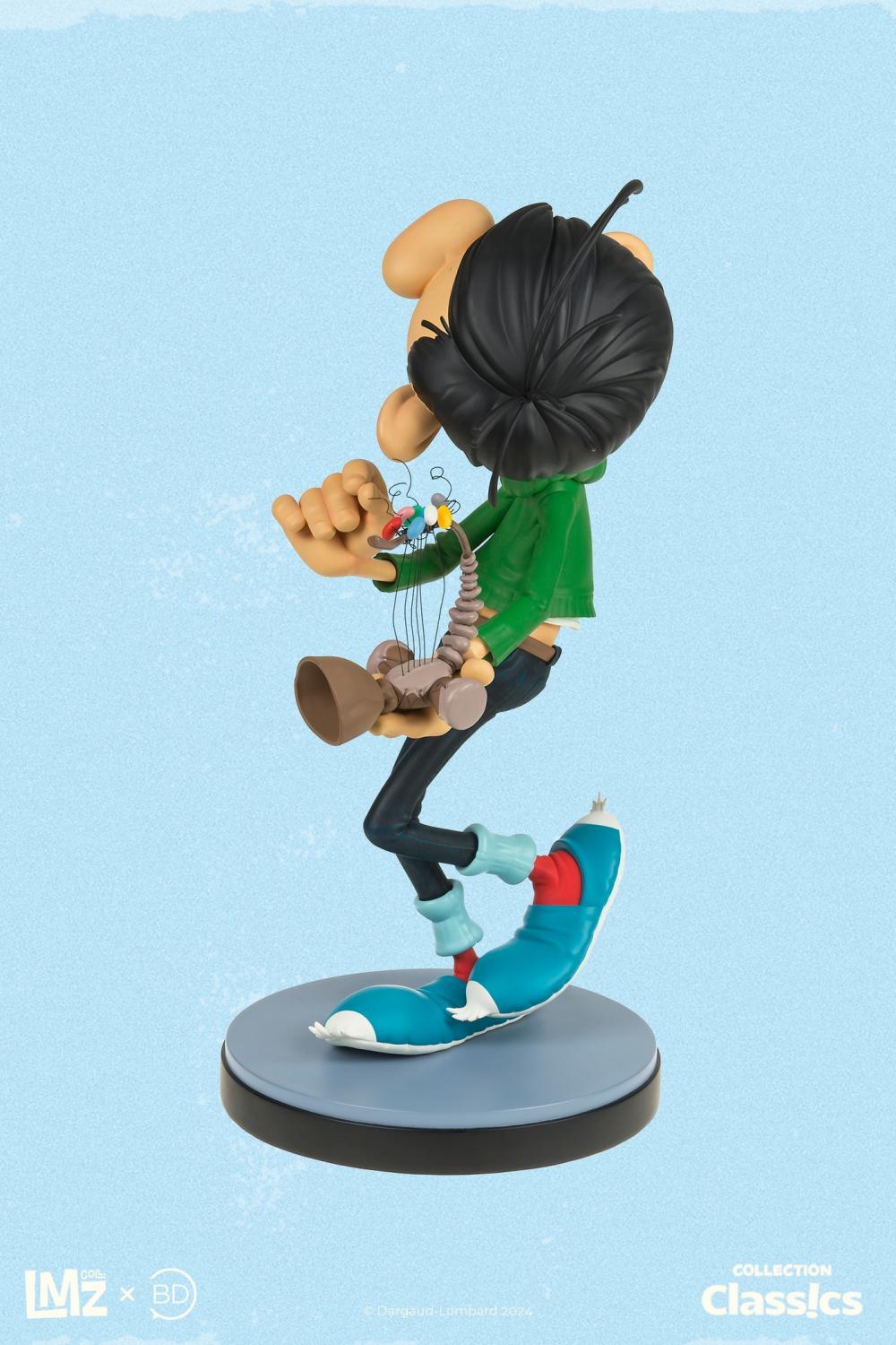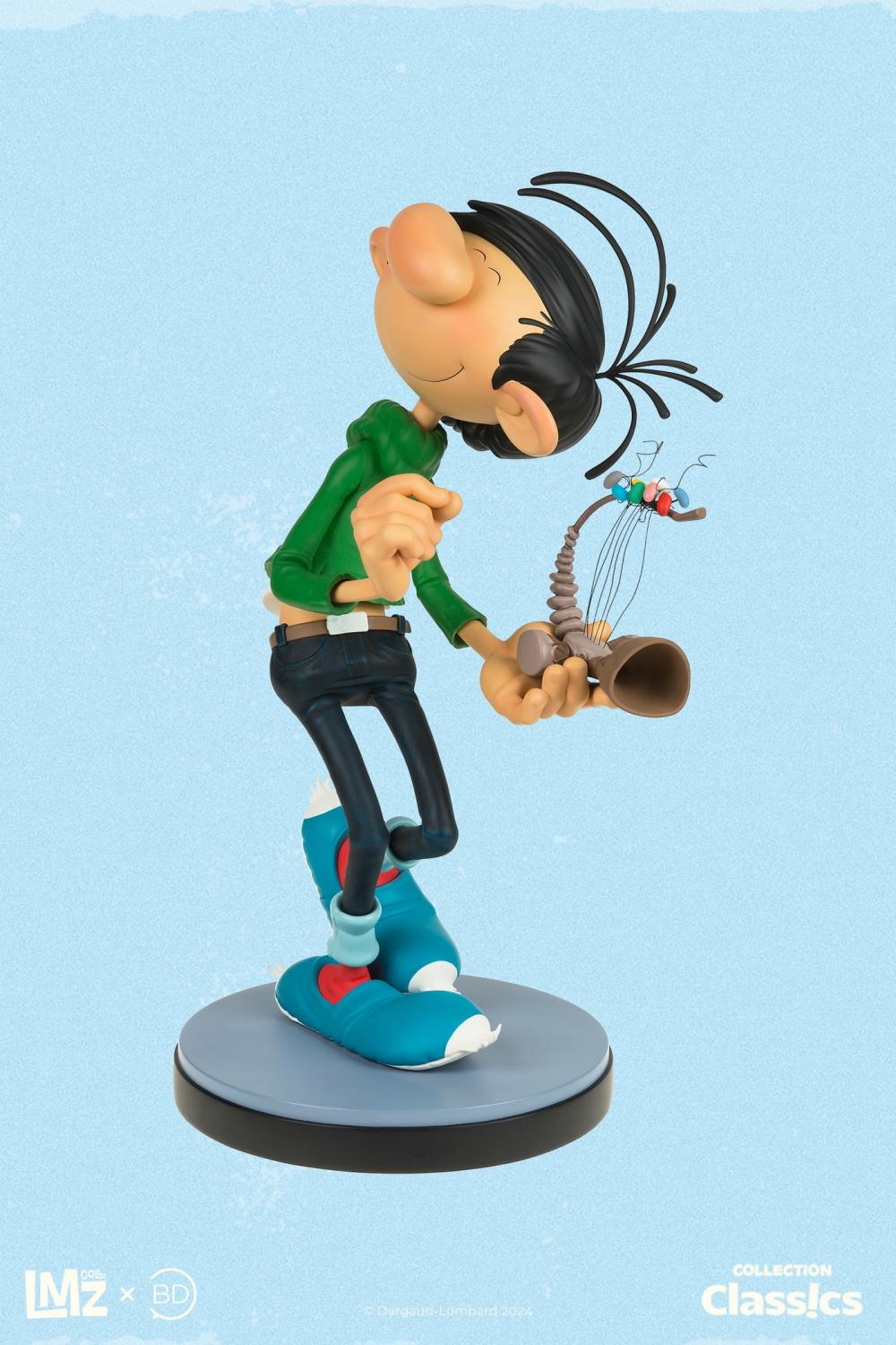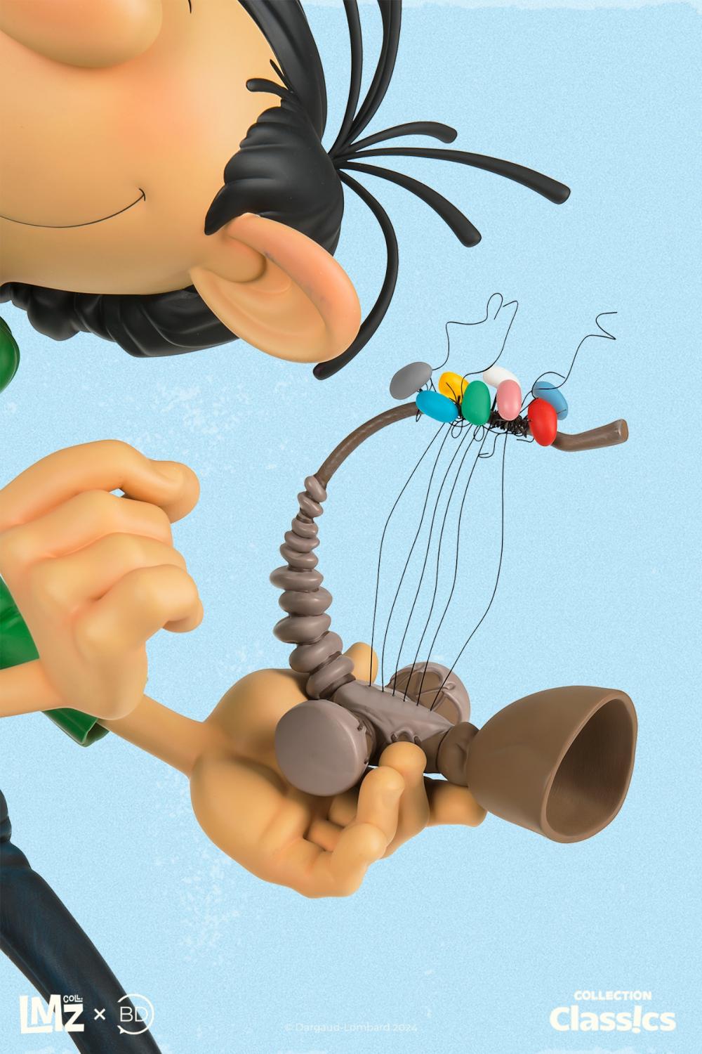 ..TRRRAOOOING...KIRIKITUIIIIIINGTRRRR...TOOOOOOOWOOOOOOOOOOWOOO...TRAGAWDOUKOUTRRR... Découvrez la nouvelle figurine de Gaston Lagaffe et son petit Gaffophone, coédition LMZ Collectibles X Collector BD dans la collection Class!cs. Cette figurine reprend la couverture iconique du tome 6 de la série, (devenu tome 7 depuis 2009). Le petit Gaffophone, qui garde toute sa puissance malgré sa petite taille, tient ici dans la main de Gaston. Le Gaffophone grandeur nature, fait son apparition pour la toute première fois sur la planche 449 dans le Spirou n°1508 en 1967. Pour créer cet instrument avec "Une vibration du tonnerre, avec une résonance maximum !", Franquin s'est inspiré d'une harpe africaine exposée au Musée royale de l'Afrique centrale de Tervuren (Belgique). Ce n'est qu'à la sortie de l'album 6, dont s'inspire notre figurine, que le petit Gaffophone entrera réellement en scène. Cette arrivée anachronique est due à la publication plus tardive de l'album, en 1968. Petit mais toujours aussi destructeur comme en témoigne le portrait de Fantasio qui se détache du mur avec fracas. On peut y voir un clin d'oeil à la disparition progressive de ce personnage dans l'univers de Gaston, le rôle de celui-ci étant repris en grande partie par Prunelle (Fantasio fera sa dernière apparition dans la planche 551 des gags de Gaston). David Arnould a mis son talent au service de cette interprétation de Gaston Lagaffe, tout en tachant de restituer fidèlement le style graphique de Franquin et la morphologie caractéristique de son personnage. Sculpture Digitale: David Arnould Direction Artistique: Arnaud Tanguy Packaging: Romain Diguet Photos: Nicolas Willmann Création Française. Moulée, assemblée et peinte à la main en Chine. Livrée dans une belle boite imprimée et accompagné de son certificat numéroté.