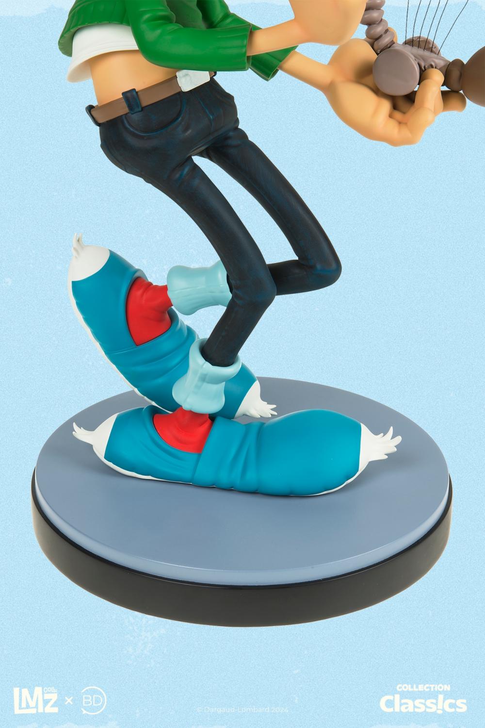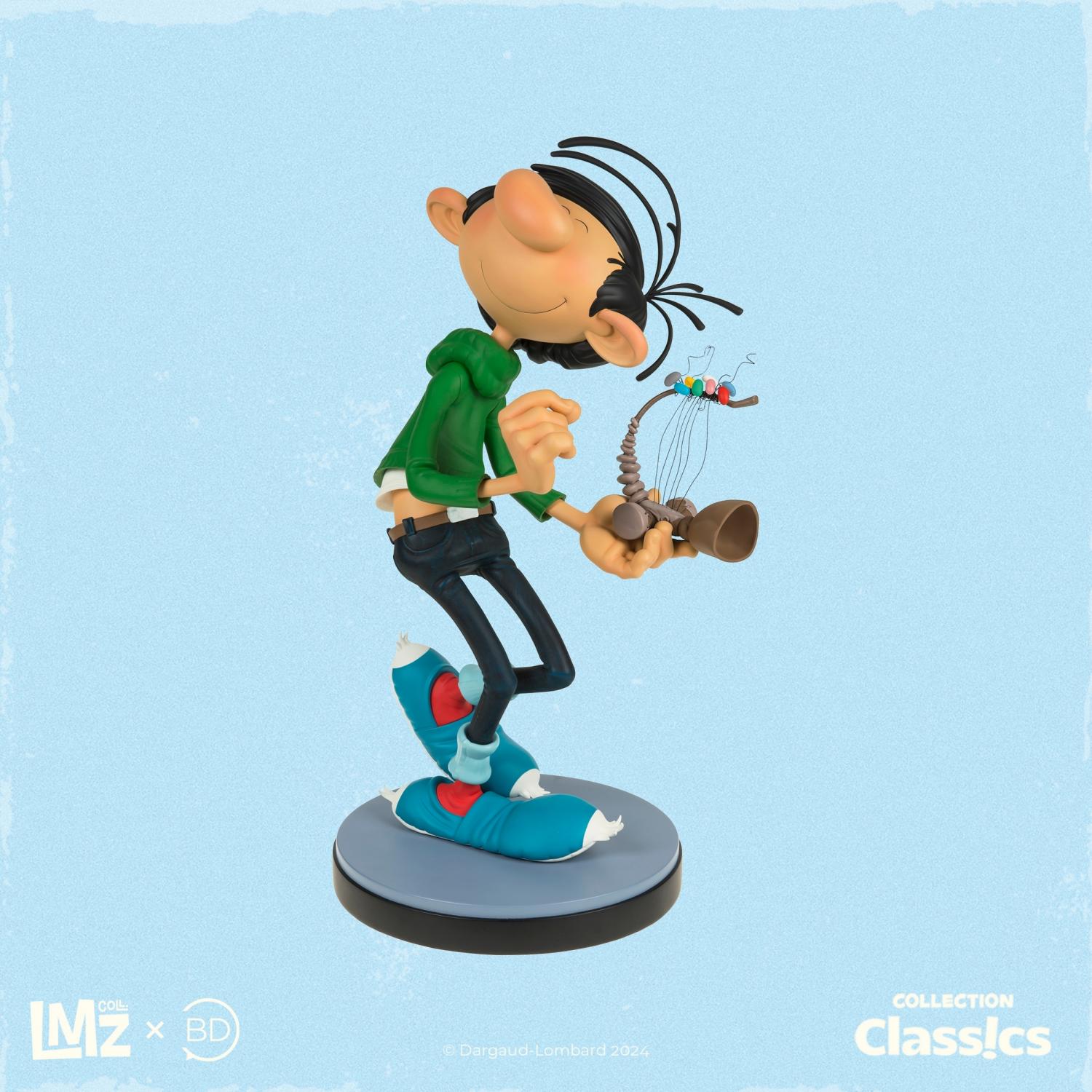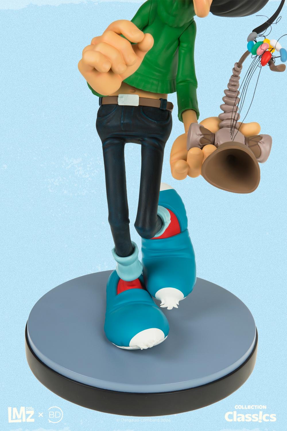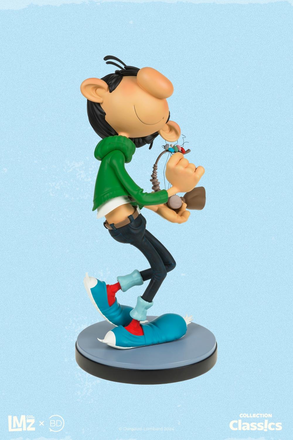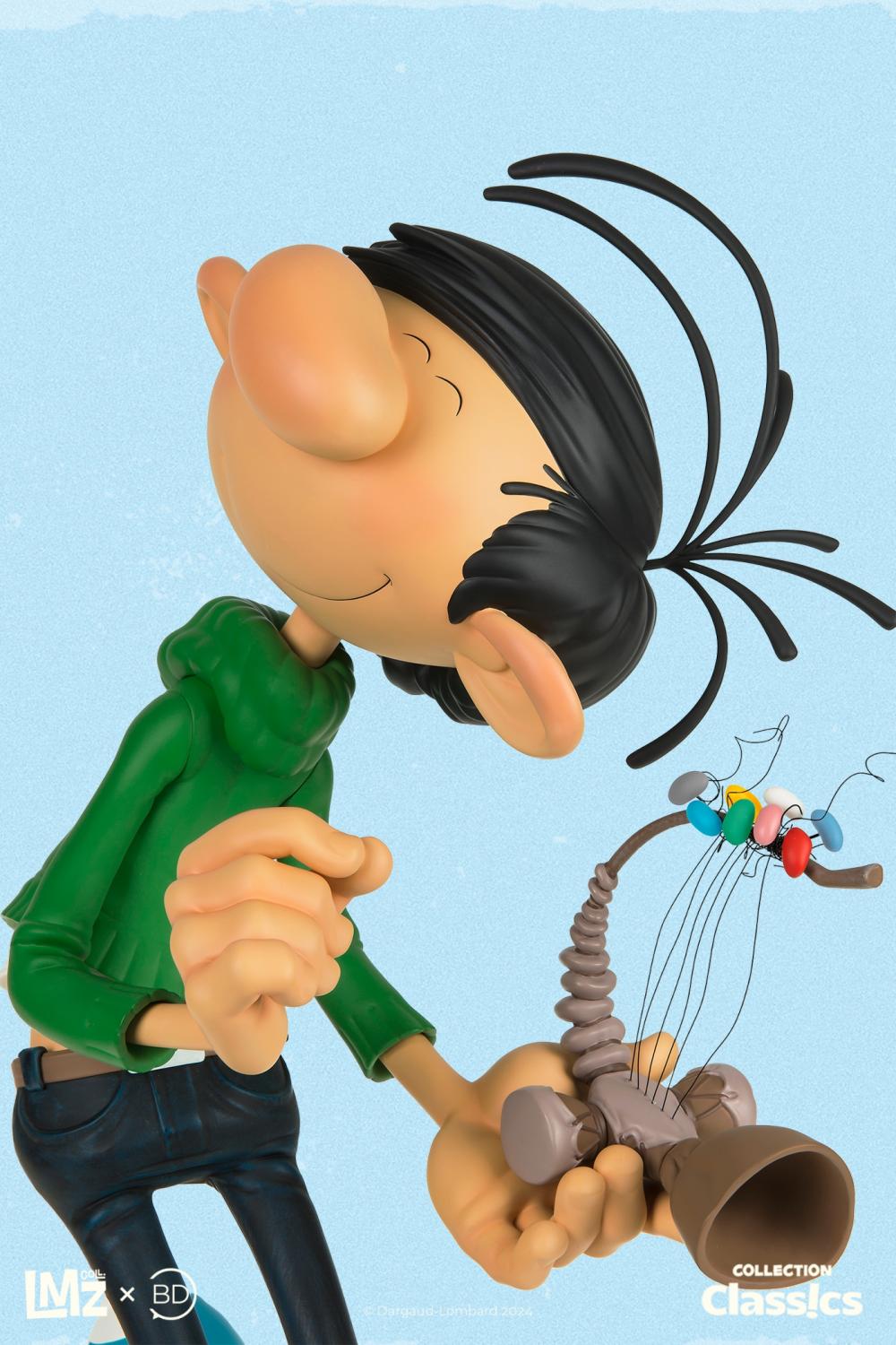 ..TRRRAOOOING...KIRIKITUIIIIIINGTRRRR...TOOOOOOOWOOOOOOOOOOWOOO...TRAGAWDOUKOUTRRR... Découvrez la nouvelle figurine de Gaston Lagaffe et son petit Gaffophone, coédition LMZ Collectibles X Collector BD dans la collection Class!cs. Cette figurine reprend la couverture iconique du tome 6 de la série, (devenu tome 7 depuis 2009). Le petit Gaffophone, qui garde toute sa puissance malgré sa petite taille, tient ici dans la main de Gaston. Le Gaffophone grandeur nature, fait son apparition pour la toute première fois sur la planche 449 dans le Spirou n°1508 en 1967. Pour créer cet instrument avec "Une vibration du tonnerre, avec une résonance maximum !", Franquin s'est inspiré d'une harpe africaine exposée au Musée royale de l'Afrique centrale de Tervuren (Belgique). Ce n'est qu'à la sortie de l'album 6, dont s'inspire notre figurine, que le petit Gaffophone entrera réellement en scène. Cette arrivée anachronique est due à la publication plus tardive de l'album, en 1968. Petit mais toujours aussi destructeur comme en témoigne le portrait de Fantasio qui se détache du mur avec fracas. On peut y voir un clin d'oeil à la disparition progressive de ce personnage dans l'univers de Gaston, le rôle de celui-ci étant repris en grande partie par Prunelle (Fantasio fera sa dernière apparition dans la planche 551 des gags de Gaston). David Arnould a mis son talent au service de cette interprétation de Gaston Lagaffe, tout en tachant de restituer fidèlement le style graphique de Franquin et la morphologie caractéristique de son personnage. Sculpture Digitale: David Arnould Direction Artistique: Arnaud Tanguy Packaging: Romain Diguet Photos: Nicolas Willmann Création Française. Moulée, assemblée et peinte à la main en Chine. Livrée dans une belle boite imprimée et accompagné de son certificat numéroté.