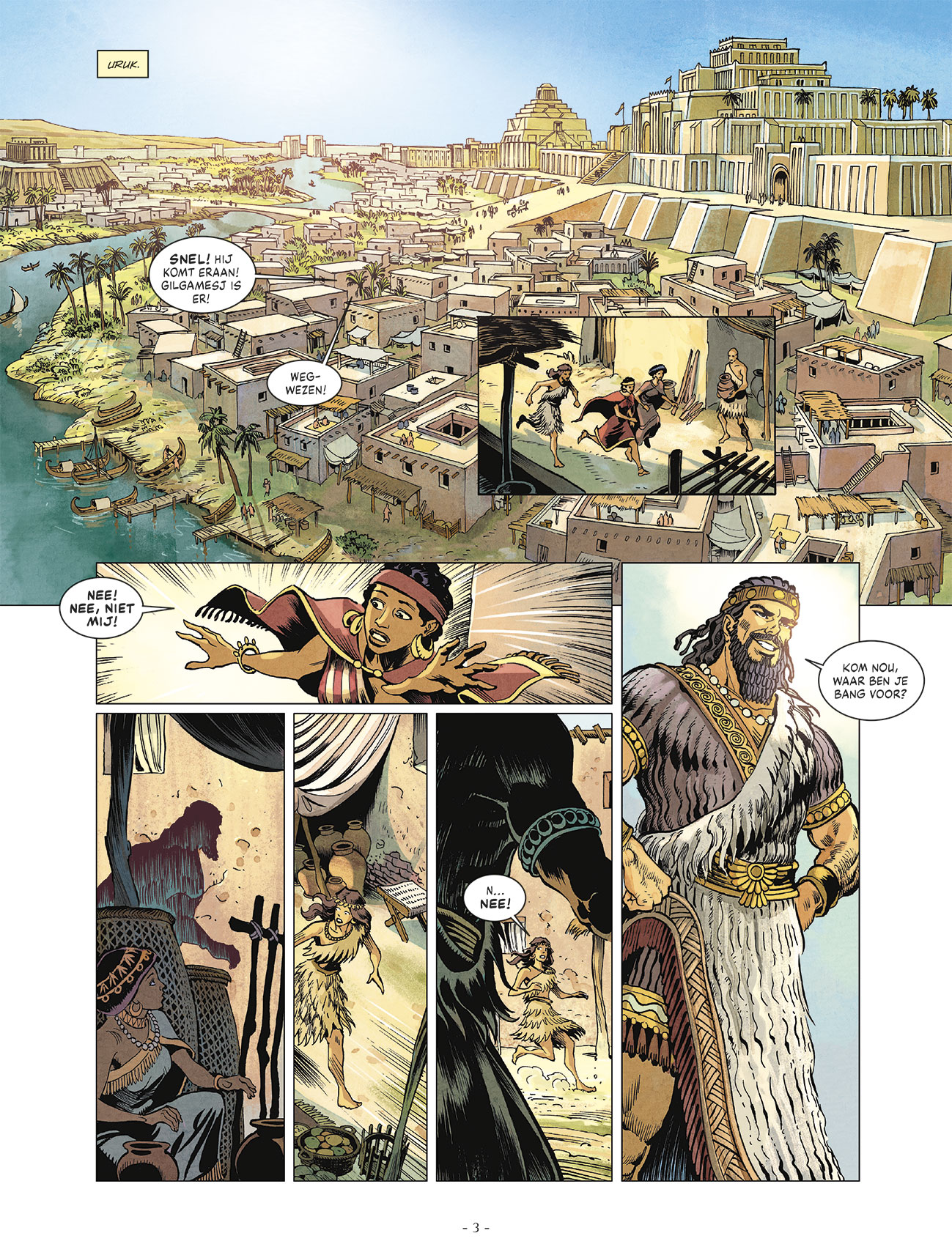Een nieuwe trilogie in de collectie “De wijsheid van mythes” Met Gilgamesj gaan we nog wat verder terug in de tijd, naar een van de eerste echte heldendichten Clotilde Bruneau weet met haar scenario’s telkens de kern van de mythe te raken– met uitgebreid dossier over de betekenis van de mythe In het oude Mesopotamië regeert de machtige koning Gilgamesj als een tiran over de stad Uruk. Zijn onderdanen worden gek van zijn gewelddadige en hoog moedige gedrag en zij smeken om goddelijke genade. De goden besluiten daarop een alter ego te scheppen voor de koning, in de gedaante van Enkidoe, die op alle punten op Gilgamesj lijkt. Hij is de enige die met hem kan wedijveren wat kracht en moed betreft. Terwijl hij leert een beschaafd man te worden , ontdekt Enkidoe wat voor wandaden zijn dubbelganger pleegt. Een confrontatie lijkt onafwendbaar...