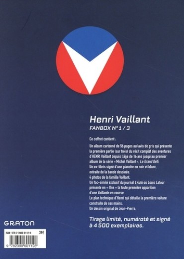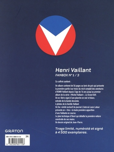 Le jeune Henri Vaillant est Breton. Et donc têtu ! Ce qui le pousse à aller en Alsace afin de se faire embaucher par la célèbre firme Bugatti ! Il s'y fera une jolie place, même si son rêve ultime est de devenir pilote de course... De quoi lui donner envie de fonder sa propre firme ? En attendant de découvrir toute l'histoire dans un beau et gros volume, venez découvrir le premier tiers d'Henri Vaillant dans une première fan-box numérotée et signée, proposant les 54 premières pages de Claudio Stassi en version lavis ainsi que des goodies exclusifs !