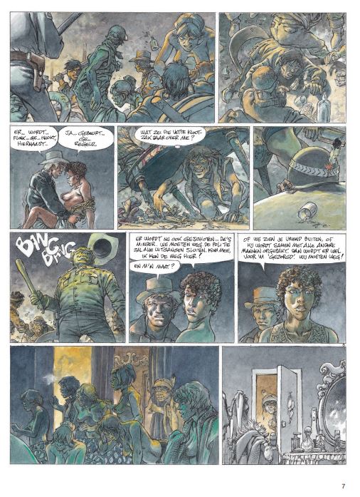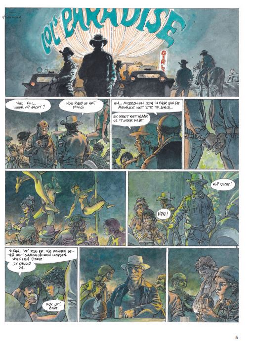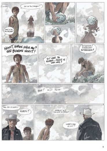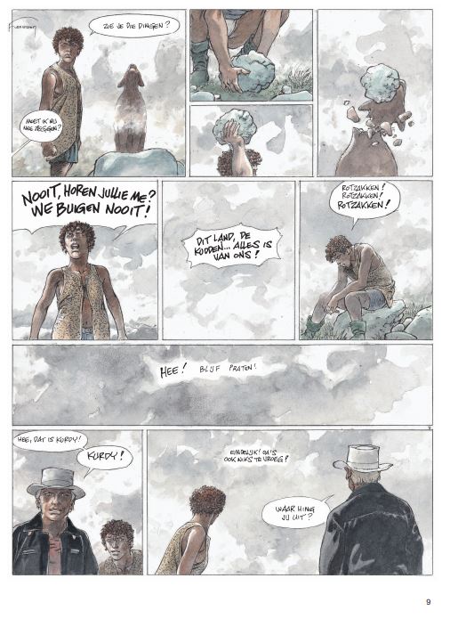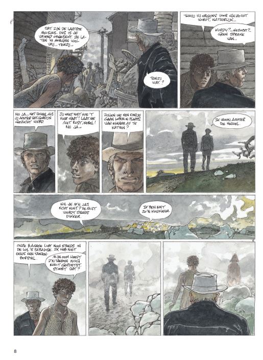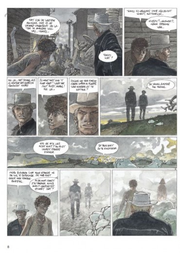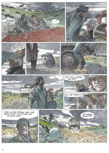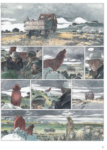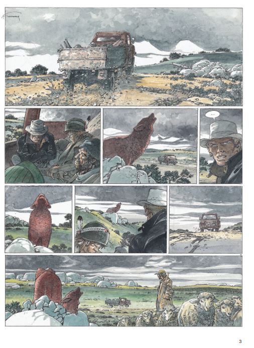 Hermann gebruikt voor deze strip een nieuwe inktpen... zie video Wanneer Jeremia en Kurdy aankomen in een verloren dorp omringd door weiden waar schapen grazen, willen ze alleen een drankje en zo mogelijk een beetje poker in de eerste drinkbar. Maar de agrarische gebieden van het gebied zijn niets meer dan een immens moeras dat braak wordt gelaten en nauwelijks wordt bewaakt door herders. Wilde en woeste beesten verwoesten de kuddes en vallen al geruime tijd mensen aan. Virna, een jonge herderin die het koud lijkt te hebben met de wet, neemt Jeremiah en zijn vriend mee naar de familieboerderij. Terwijl de twee mannen dachten daar maar één nacht te blijven, begonnen ze aan een volledige territoriale oorlog. Een deel van de bevolking besluit hun land te verkopen aan een rijke lokale bevolking, terwijl sommige boeren hun kuddes willen blijven begrazen. Maar wolven laten hen weinig keus. Zodra de mist is gevallen, is het een titanisch beest dat de schapen en hun beschermers decimeert. Voor de mooie ogen van Virna zal Jeremiah partij kiezen en vechten om een gevecht te winnen in een oorlog die al verloren lijkt.