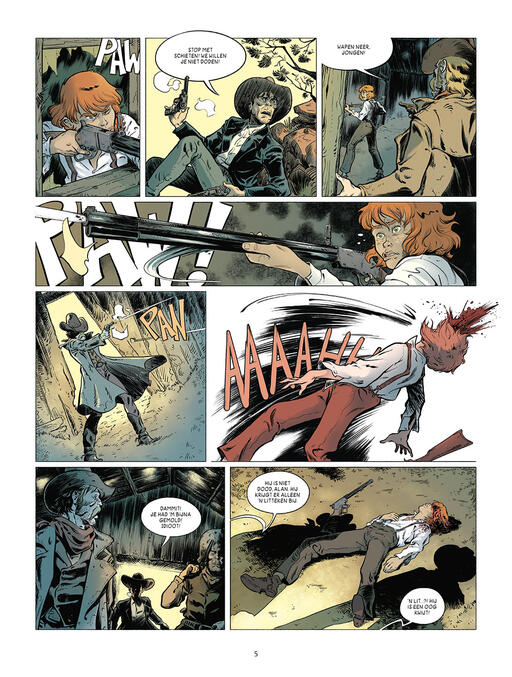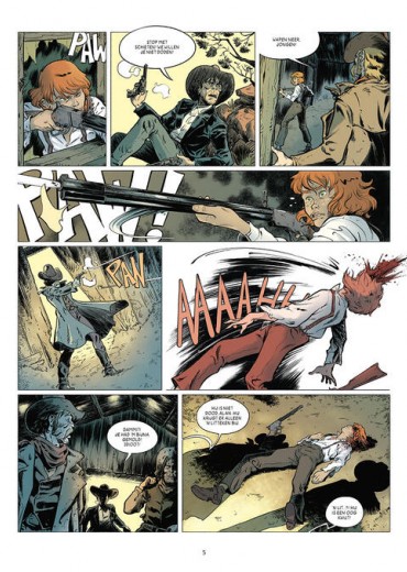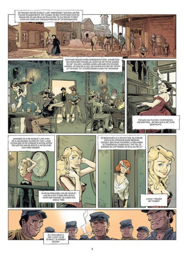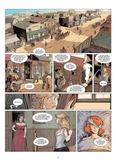Score moyen 4 / 5Het bloedbad van Tanque Verde De zomermaanden zijn niet de beste maanden voor stripliefhebbers. Het uitgeeftempo loopt tegenovergesteld aan de stijgende temperaturen en de titels die verschijnen behoren over het algemeen niet tot de verkoopkanonnen. Deze worden meestal pas in het najaar in stelling gebracht. Deze zomer zijn we echter aangenaam verrast door het eerste deel van de vierdelige reeks Six, een westernstrip van scenarist Philippe Pelaez voor de Spaanse tekenaar Javier Sánchez Casado. Samen maakten ze het tweeluik Een Stukje Spinazietaart waarvan Casterman deel 2 niet meer vertaalde. Pelaez kennen we verder ook van onder meer De Bultenaar van Montfaucon, Oliver & Peter, Oorlogswijn en Parallel. De tekenstijl van Casado doet ons denken aan die van een andere Spaanse klepper: José Luis Munuera. Casado wisselt gedetailleerde achtergronden af met meer vlakkere decors. Naarmate het verhaal vordert, waarderen we zijn stijl steeds meer en na het dichtklappen van het album kunnen we niet wachten tot het tweede deel van deze zomertopper verschijnt. Onze honger naar een vervolg komt ook door het goed doordachte en uitgewerkte verhaal van Pelaez. Het begint met de roodharige Kid die getuige is van de moordpartij op zijn familie. Hij wordt verzorgd door Elsie die als prostituee werkt in de lokale saloon. Elders wordt soldaat Quintus Jones gestraft voor zijn nieuwe poging tot desertie en samen met een indiaan weet hij te ontsnappen aan de sadistische grillen van zijn meerdere. Onderweg ontmoeten ze een gevluchte slaaf en een ontsnapte non. Dit zestal vormt een merkwaardig, maar intrigerend gezelschap waar genoeg diepgang in zit om ons vier albums lang te laten draven naar onze stripwinkel. Hoewel er veelvuldig van personages en locaties wordt gewisseld, stoort het nergens en blijft het verhaal prima te volgen. Elk personage heeft zijn eigen verhaal en dat zorgt juist voor een mooie verdeling van de spanningsboog. De temperaturen stijgen net als ons verlangen naar het vervolg van deze zomerwestern die ons zeer aangenaam heeft verrast. Liefhebbers van het genre raden we aan om de zon te trotseren en zich te begeven in het avontuurlijke spoor van Six.