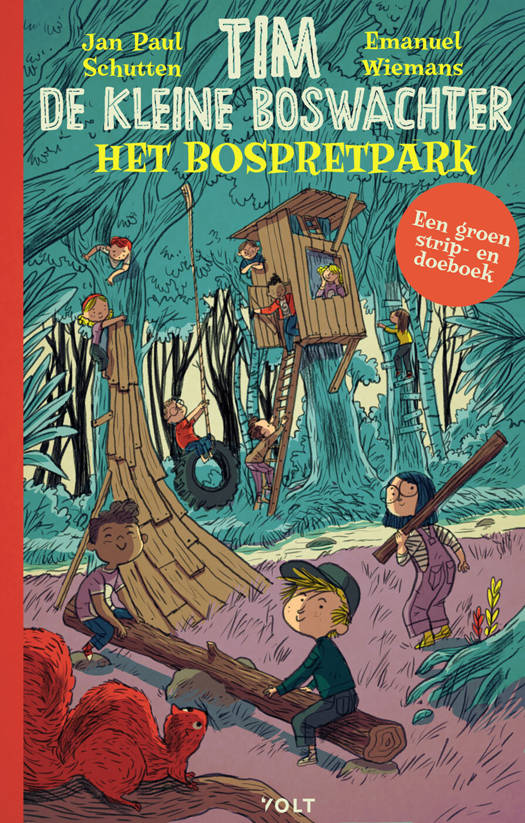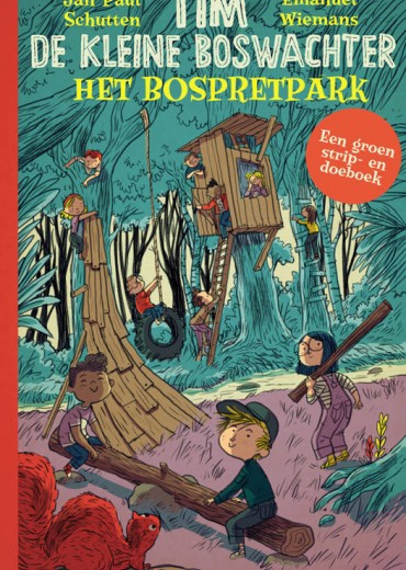 Een groen strip- en doeboek Wat een pech! Het schoolreisje kan niet doorgaan. De bus die iedereen zou brengen krijgt motorpech. Er is niet meteen een nieuwe bus beschikbaar, daarom wordt het schoolreisje afgelast. Gelukkig heeft Tim een plan. Hij legt samen met zijn vader een pretpark aan in het bos. Met schommels van banden die aan takken hangen, een reuzenwip gemaakt van een omgevallen boom, Remy die een kar trekt, een superhoge klimboom, een huttenbouwwedstrijd en heel veel andere spelletjes. Voor wie niet genoeg van Tim de kleine boswachter kan krijgen is er nu dit speelse strip- en doeboek. Het stripverhaal over het nieuwe bospretpark van Tim wordt afgewisseld met zoekplaten, een quiz, een afmaakverhaal en tekenopdrachten. Meer Tim, meer bos, meer pret!