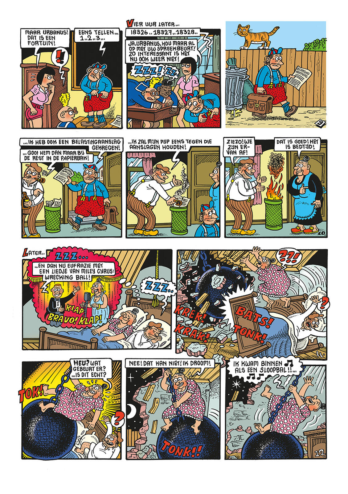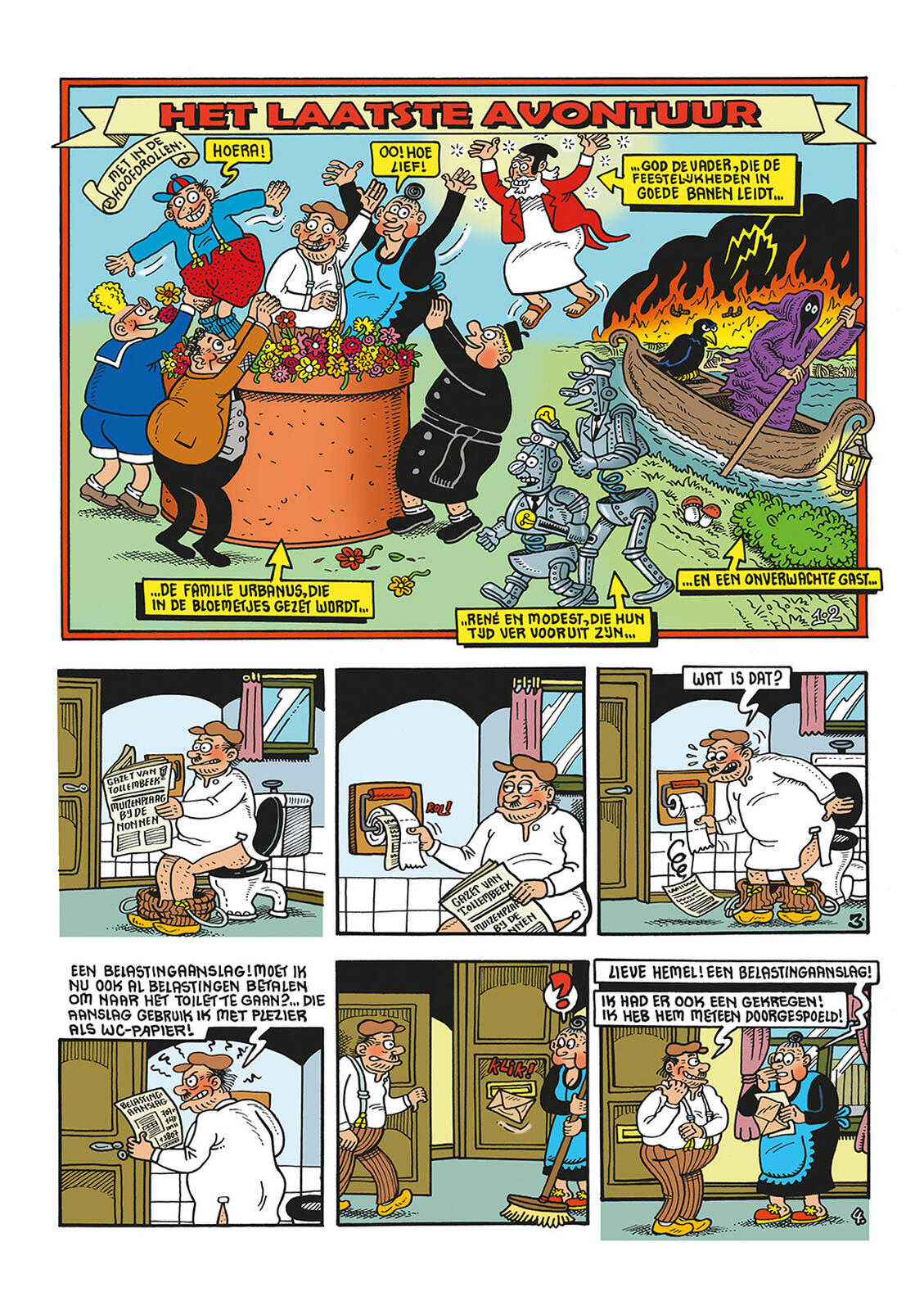 De familie Urbanus weigert belastingen te betalen en wordt uit hun huis gezet. Terwijl ze op weg zijn naar het OCMW worden ze door een veerman opgepikt. Die doet hen al snel denken aan de ‘veerman des doods’ uit de Griekse mythologie. De familie Urbanus wordt bij feestzaal ‘De vliegende engel’ afgezet. Daar heeft God de vader een groot feest voor hen georganiseerd. Op de gastenlijst staan allemaal personages uit toekomstige Urbanusstrips. De viering blijkt al snel een vermomming te zijn voor een heel ander soort feest. En dan staat er plots op het gelukskatje: nog nul avonturen…