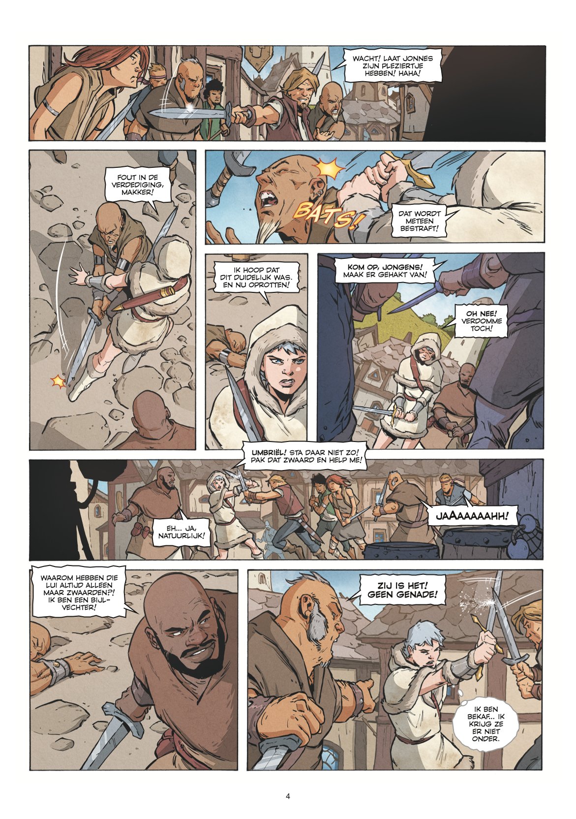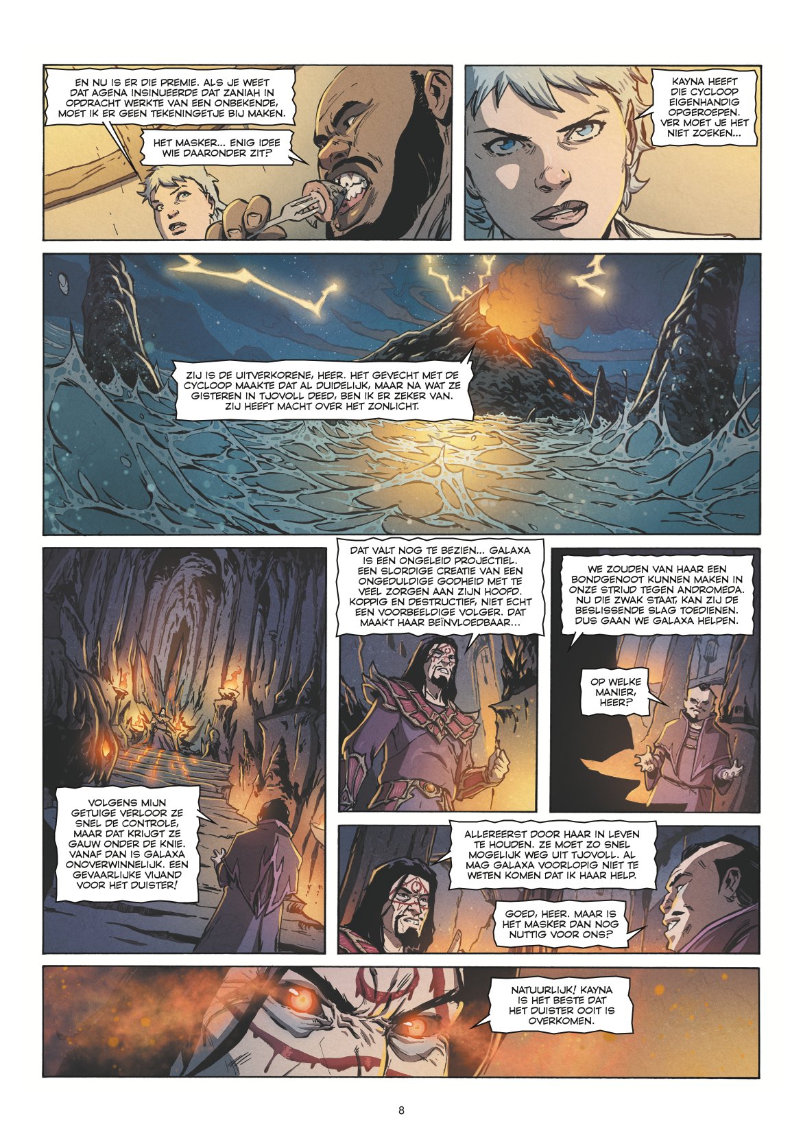 Score moyen 4 / 5Standaard Uitgeverij kondigde vorig jaar trots de nieuwe reeks ‘Galaxa’ aan met veel toeters en bellen, wat altijd wat opletten is. Maar dit bleek terecht te zijn want de eerste 2 delen werden vorig jaar door velen gesmaakt, wat zich ook weerspiegelt in de plaats die Galaxa bemachtigt in de jaarlijkse Top-100 van Stripspeciaalzaak. Nu het stilaan duidelijk wordt dat Galaxa meer dan een eenvoudige elf is en ze speciale krachten krijgt via het zonlicht, valt haar potentieel niet bij iedereen in goede aarde. In de vorige delen wist Galaxa ternauwernood te ontsnappen aan Zaniah en Agena, die haar duidelijk liever een kopje kleiner zagen. Nu ze op de vlucht is, komt ze een bende tegen die haar opwachten en het gevecht met Galaxa en Umbriël, haar reisgezel, aangaan. Daarop besluit Galaxa te vluchten naar Tyriffa om onder te duiken tot de storm gaan liggen is. Als ze even later de overtocht op zee willen maken, worden ze aangevallen door agressieve zeewezens. Deze krijgen de overhand en ze doden de schipper. Het ziet er bijgevolg niet goed voor Galaxa en Umbriël… Intussen brengt Andromeda, de verkozene van de Elfen, bericht aan Zaniah dat Galaxa gratie moet krijgen en ze haar moeten terug halen. Lukt het hen om Galaxa terug te halen? Weet Galaxa zich te redden bij de zeewezens ? En wat met de gemaskerde persoon, wie is dit en waarom moet Galaxa dood ? Dit deel sluit de eerste trilogie af, maar zet al meteen de toon voor de volgende delen. Scenarist Peter van Gucht (Nachtwacht, Suske&Wiske, Lut,…) en tekenaar Romano Molenaar (Storm, J.Rom, …) zetten er vaart achter, want de delen volgen elkaar vlotjes op. Het verhaal wordt verder opbouwend voort gezet en houdt er de nodige spanning en mysterie in. Beetje per beetje komen we iets meer te weten over de gemaskerde persoon en wat er zich allemaal speelt. Het tekenwerk blijft ok, geen overdadige details maar duidelijke tekeningen. Het inkleuringswerk met de nodige speciale effecten door inkleurder Shirow Di Rosso (Bergenvaarders, de huivering,…) brengt duidelijk meerwaarde hierbij. Dit deel blijft met andere woorden op hetzelfde niveau als de vorige delen, wat ons dus aangenaam leesplezier brengt. Galaxa is niet speciaal een grote ode aan de Rode Ridder, maar brengt ons wel een degelijk verhaal en een nieuwe, leuke reeks ! Dit kunnen we enkel maar aanmoedigen !