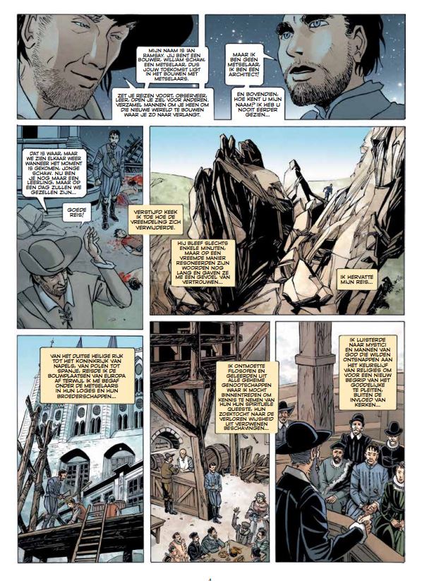 Een reeks uit 12 delen die volgens planning in 3 jaar zou moeten verschijnen. Telkens complete verhalen met extra-dossier. dit stripalbum werd getekend door Wagner Vincent die onder andere ook deze stripreeksen tekende of aan meewerkte 1. Betoverd Venetie 2. Mysteries 3. Sint Nikolaas 4. Wild River Stripscenarist van de partij is Boisserie Pierre ( onder leiding van Convard) die we kennen van volgende stripreeksen: 1. De Bankier van het rijk 2. Dantes 3. De Bank 4. Flor de luna 5. Het Kruis van Cazenac 6. Nakara 7. Reiziger 8. Roma 9. Sint Bartholomeus 10. Wolf Op 24 augustus 1572 was de Schotse architect William Schaw in Parijs hulpeloos getuige van het bloedbad van Saint-Barthélemy. Hij blijft diep verbluft door deze bloedige gebeurtenissen. Is er alleen geweld om geschillen op te lossen? Deze vraag zal William voor altijd kwellen en de koers van zijn lot aangeven. Na bijna tien jaar op de Europese wegen, ontmoet William een vreemde weduwe die hem een fragment van Salomon's tempel toevertrouwt. Voor hem is het een teken. Want door het heilige fragment toe te vertrouwen, geeft de weduwe het ook een missie: de Schotse metselaars verenigen en onder de controle van de koning plaatsen. Om dit doel te bereiken, ontdekt William het bestaan van een mysterieuze en oude broederschap van metselaars waarin Schaw de humanistische voorschriften zal herkennen die hij altijd al heeft willen overbrengen. Politieke intriges en reizen in het 16e-eeuwse Europa staan in de schijnwerpers in het derde deel van The Epic of Freemasonry, dat ons blijft vertellen over de grote oprichtingsgebeurtenissen van de beroemde, maar daarom niet minder mysterieuze, organisatie van de Franken. - metselaars.