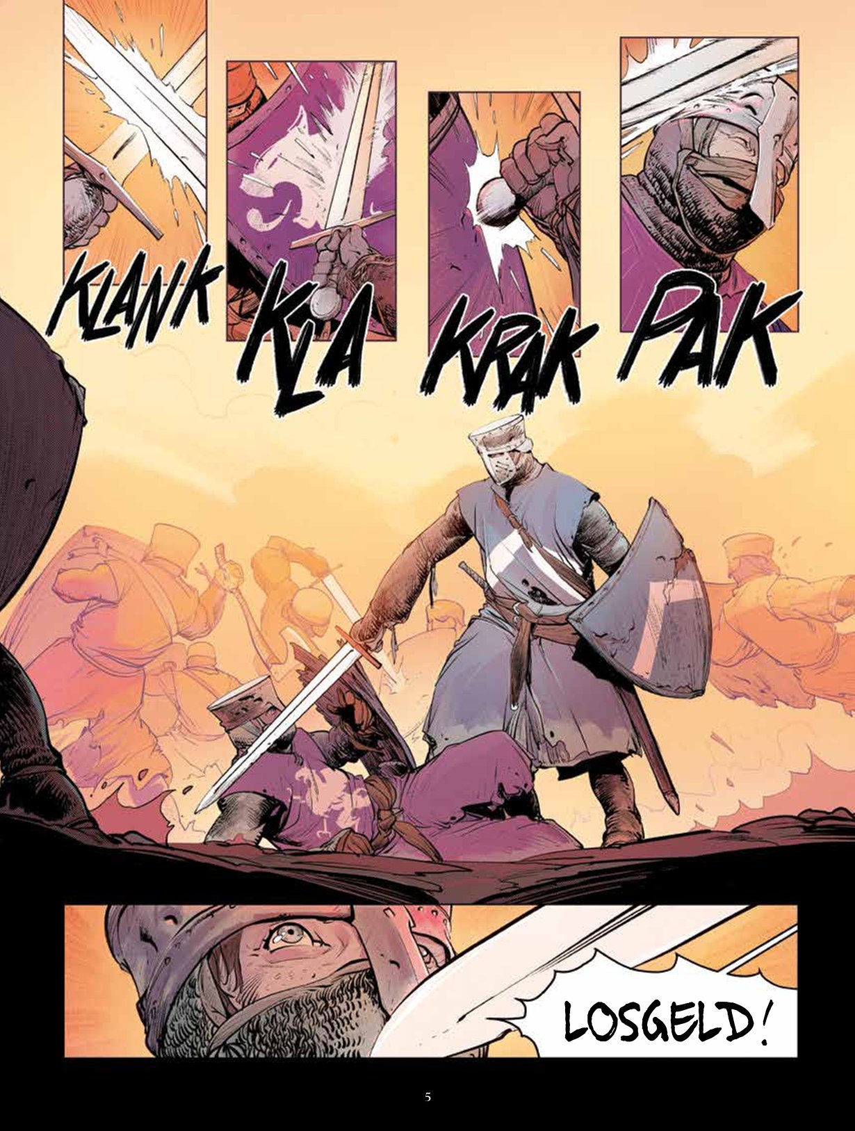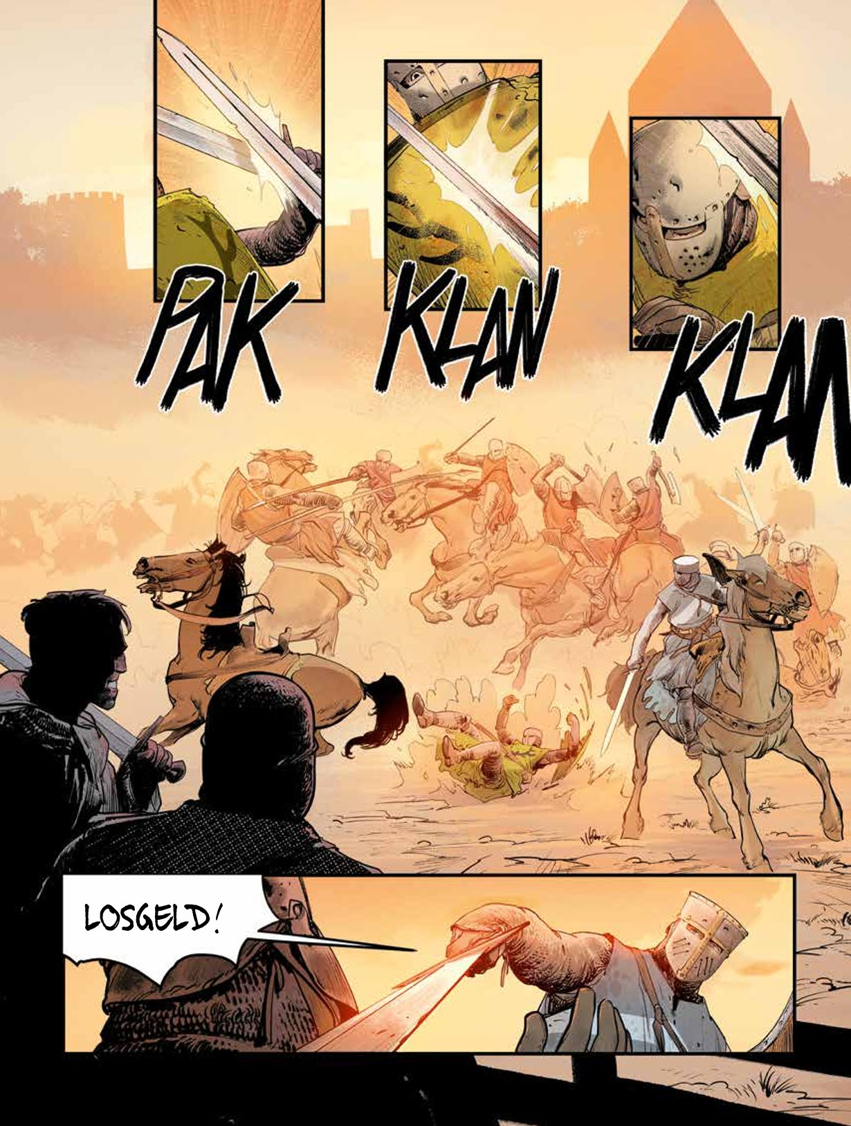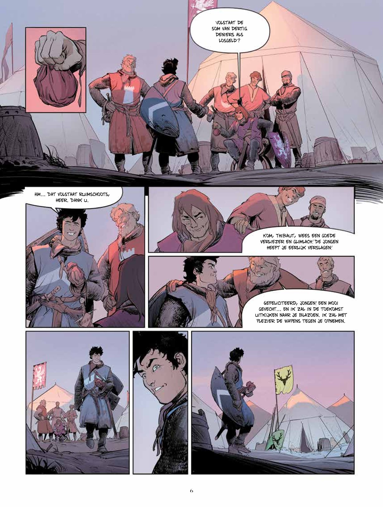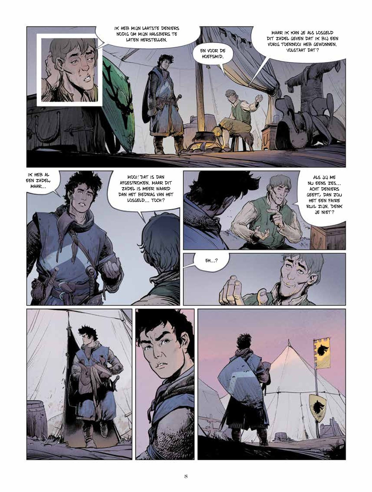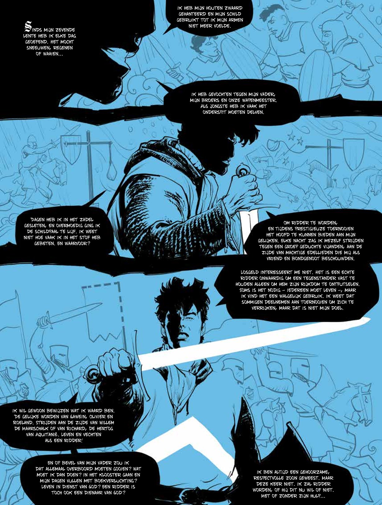 Een spannende kijk in de wereld van ridders en tornooien! Josselin en Jehan zijn twee dolende ridders die leven van tornooi naar tornooi en hun kost proberen te verdienen door hun tegenstander van die dag uit te schakelen. Paulin, de schrandere schildknaap van Jehan, reist mee en blijkt vaak een grote troef te zijn. Het drietal is uit op geld en roem, zoals zovele anderen. Maar er is toch een detail waarin ze verschillen van die anderen: onder de maliënkolder blijkt Jehan een vrouw te zijn… Josselin droomt ervan om de Zwarte Ridder te verslaan, een anonieme tegenstander die zijn helm nooit afneemt, altijd alleen is en nooit verslagen wordt. Tijdens een tornooi georganiseerd door de graaf van Joigny hoopt Josselin eindelijk van hem te winnen. Helaas, hij verliest, wordt gewond en moet plaats ruimen voor Jehan. Zal zij opgewassen zijn tegen haar geduchte tegenstander? Na Ira Dei duiken Vincent Brugeas en Ronan Toulhoat, samen met Yoan Guillo in het universum van ridders en tornooien. Ze vertellen een knap verhaal vanuit het perspectief van hun innemende personages.