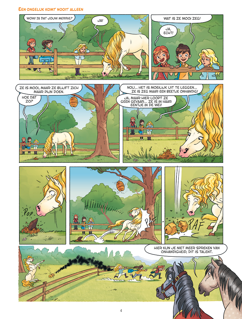 Bang, vurig, prachtig of belachelijk, de paarden en pony's van de mallotigste manege gaan door met hun capriolen in een tweede album vol allure! Xanax, Zorro, Flash en de anderen maken kennis met Bella, de wat stuntelige merrie die eruitziet als een diva! Bij haar wordt de uitdrukking 'voor iemand vallen' wel heel letterlijk! Maar haar eigenaresse, tja, zelfs de supervriendelijke pony Bijou kan haar niet uitstaan. Baloe, het kolossale werkpaard, vindt dat het zo niet verder kan ... Als dat maar goed gaat! Te paard! is een humorstrip voor paarden- en andere dierenliefhebbers van alle leeftijden!