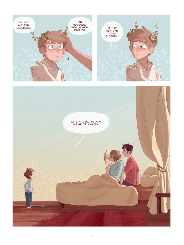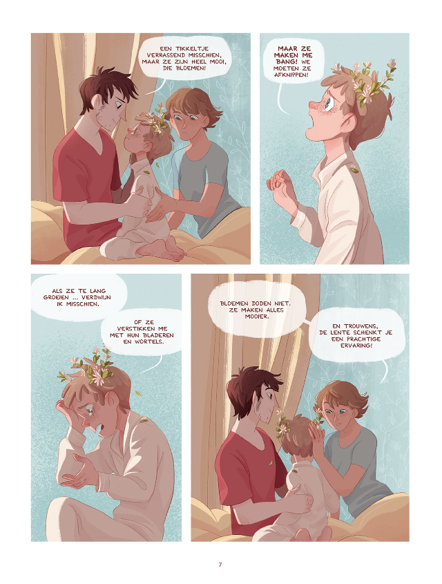 Un jour de printemps, des fleurs poussèrent sur la tête du grand frère. Au début, cela lui fit peur et il ne savait pas quoi en faire. Avec son petit frère, il alla voir leur grand-mère, qui connaît tout des fleurs. Mais celles-ci, elle ne les avait encore jamais vues.