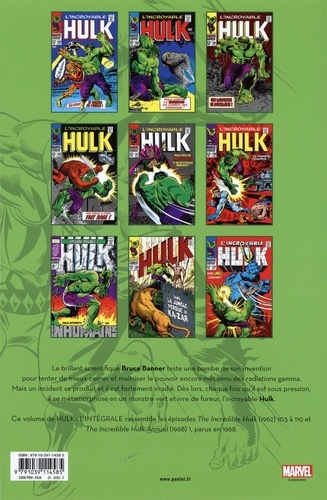 Hulk vit sa première aventure dans le cosmos, et se retrouve face au Parasite de l'Espace. Puis, de retour sur Terre, il affronte le Rhino, le Mandarin ou encore les Inhumains au grand complet. Même la Terre Sauvage a du souci à se faire suite au passage de l'alter ego de Bruce Banner ! En parallèle des volumes recueillant la longue période où Peter David a scénarisé les aventures du Géant Vert, nous revenons aux origines de la saga, avec des épisodes datant de 1968 jamais réédités en France depuis quarante ans. L'Annual de 50 pages confrontant Hulk aux Inhumains est même publié pour la première fois dans l'Hexagone dans cet album !