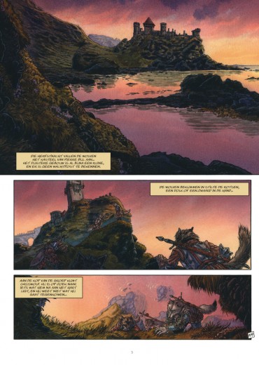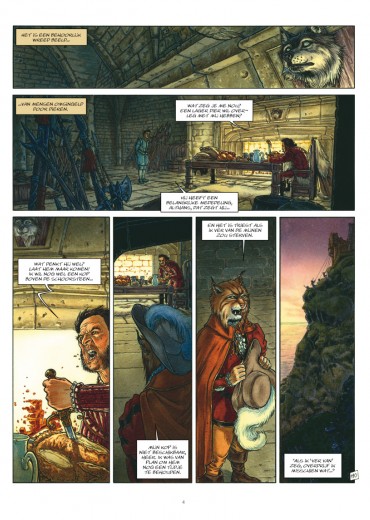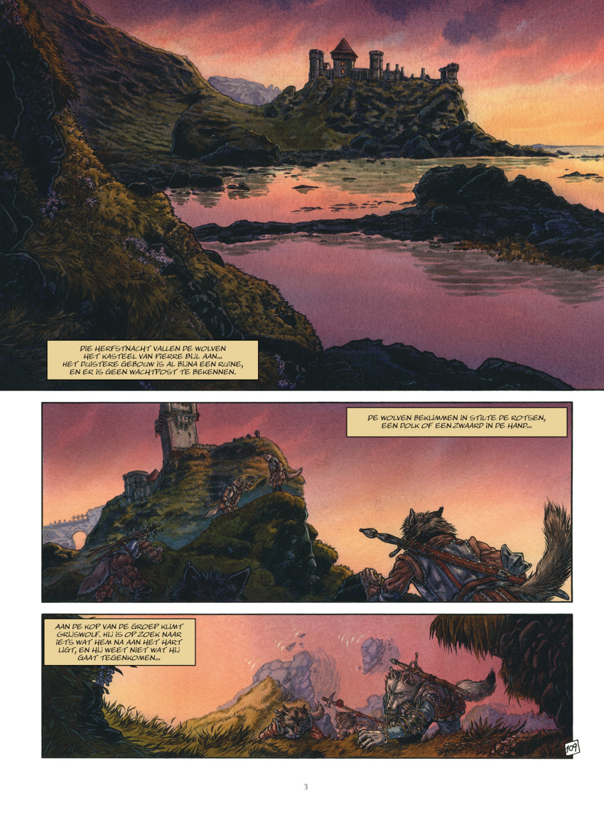 Het was de bedoeling dat er een historische gebeurtenis zou plaatsvinden, iets unieks in de geschiedenis van mens en dier." Huid en vacht worden één. Een gedwongen huwelijk voor een wapenstilstand. Aube huwt Vuurwolf, de machtigste oorlogsheer van de wolven. De broer van Vuurwolf is niet op het feest. Hij is getrouwd met een vos (een lagere diersoort). Maar... er is gif in het spel. Aube, samen met haar broer Salviat, vermoorden Vuurwolf. Aube vlucht naar het Maagdenbos. Daar is ze veilig, zolang ze maagd blijft. De strijd barst los. De mensen met hun 'donderbussen'. De beesten met kracht en moed. De koning wil Clam, de wolvendoder, vinden. Meester Arcan, vader van Aube, weet er meer over, maar die is verbannen. Zijn familie heeft haar woord gebroken. Hugo moet Clam gaan zoeken. Maar Grijswolf, de broer van Vuurwolf, is er ook nog. Maar zijn huwelijk met Dame Vos heeft de familie bezoedeld. Na een gesprek met zijn vader, Trekwolf, wil Grijswolf zich niet mengen in de strijd. Trekwolf wordt echter gedood door Pierre Bijl. Dit verandert de zaak. Ondertussen ontmoet Hugo Clam. Door een verbond tussen de Hogere en Lagere dieren hebben de mensen de strijd verloren. Het portret in de medaillon van Clam is Aube. In het Maagdenbos vinden we veel fabeldieren: centauren, sirenen, harpijen, faunen, medusa's... en Clam! Hij redt Aube van een harpij. Pan, de leider van de faunen kiest de kant van de wolven. Dat zorgt ook in het Maagdenbos voor oorlog. Clam is geboren uit de liefde van een wolf en een mens. Hij is dus een weerwolf en is bang dat hij Aube iets zou aandoen. Het Maagdenbos wordt door de vlammen verwoest. Pierre Bijl wordt gevonden en gedood door Grijswolf. Ook de beren mengen zich in de strijd met hun leider Heer Leerboor. Vel en vacht treden in een kerkelijk huwelijk. Clam, nu wolf, doodt Heer Leerboor in een duel. Het pact tussen mens en dier wordt terug hersteld. De liefde tussen Aube en Clam heeft dit voor elkaar gekregen. De prachtige tekeningen van Béatrice Tillier alleen al zijn de moeite om deze drie albums aan te schaffen. Niet moeilijk dat zij werd gekozen om de derde cyclus van 'De Klaagzang van de Verloren Gewesten' verder te zetten. Aube werd gebaseerd op actrice Cécile de France (van o.a. L'Auberge Espagnole) en Clam op acteur Rutger Hauer (van o.a. Blade Runner).