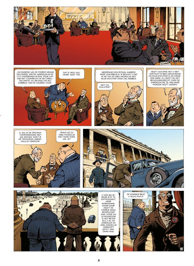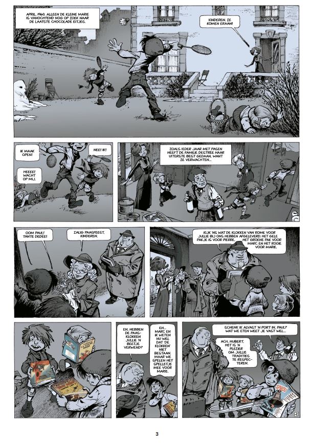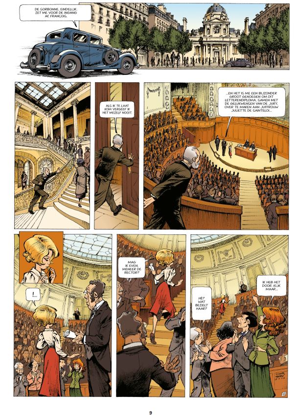 “Mademoiselle J. 1938 Ik zal nooit trouwen” is het tweede album uit een (voorlopige?) reeks van drie in een realisatie van scenarist Yves Sente en tekenaar Laurent Verron bij Uitgeverij Dupuis. Verron, geboren in het Franse Grenoble in 1962, is al jaren een vertrouwd gezicht in de Belgische stripwereld. Midden de 80er jaren solliciteerde de autodidact op een advertentie van wijlen Jean Roba, de geestelijke vader van “Bollie en Billie”. Tot zijn grote verbazing kreeg Verron de job en kon hij aan de slag bij Roba. Hij wilde persé een eigen reeks en die kwam er met “De Maltezer” in 1991. Wat later leerde hij scenarist Yann kennen. Dat resulteerde in 1994 in het heel leuke en humor getinte debuutalbum “Papoea’s” in een reeks van zeven stripverhalen rond pater-missionaris “Govert Suurbier”. Halfweg 2003 ging Jean Roba met pensioen en nam Verron de “Bollie en Billie”-reeks over tot in 2016. De tijd was rijp voor Laurent om terug te keren naar historische striptekeningen uit de 30er jaren van de vorige eeuw. Twee jaar later lag met “Ze noemden hem rooie” de samenwerking tussen Verron en Sente in de reeks “Robbedoes getekend door …” op de striptoonbank. Het album wordt een topper waardoor het hoofdpersonage Juliette De Sainteloi meteen haar eigen reeks “Mademoiselle J.” krijgt. De tiener uit het eerste album is ondertussen een knappe, intelligente verschijning van 22 lentes geworden. Ze studeert met brio af aan de Sorbonne waar ze haar diploma Letteren behaalt. Juliette heeft er alles voor over om een top journaliste te worden. Als vrouw is dat in het journalistieke wereldje van toen echter heel moeilijk. Maar Juliette heeft ook andere katjes te geselen. Haar vader Henri leidt met investeerder Gustave Noirhomme de Compagnie van de Vijf Oceanen. Ze kunnen een gouden deal afsluiten met Herr Von Riblach die rechtstreeks in contact staat met Adolf Hitler himself. Maar Juliette, die na de dood van haar ma aandelen erfde van de firma, is ronduit tegen. Ze krijgt weet van de invalsplannen van de Nazi’s en wil er helemaal niets mee te maken hebben. Wat later kan ze aan de slag bij de linkse krant “Horizon France” als stagiaire van de norse Daniel Fraiser. De frequent rokende Juliette bijt zich daar onmiddellijk vast in een wel heel onkiese oorlogszaak met verstrekkende gevolgen… De tekenstijl van Verron is al jaren subliem te noemen. Wie zijn vroegere reeksen als “De Maltezer” of “Govert Suurbier” kent, weet dat Laurent een krak is in zijn vak. Hij verstaat dan ook als geen ander hoe hij het scenario van Sente moet verstrippen. Verron zuigt je als het ware mee in zijn sublieme tekeningen. Het zal voor elke lezer duidelijk zijn dat “Ze noemden hem rooie” dan ook geen one-shot mocht zijn in de Robbedoes story. Als lezer blijf je 62 pagina’s lang op het puntje van je stoel zitten om de pointe van scenarist Yves Sente te ontdekken. En dat de vertellende Oom Paul en Rob-Vel ook nu weer van de partij zijn, zal niemand verbazen. Dit is dan ook een echte aanrader. Er is ook bijzonder goed nieuws voor die lezers die nu pas de miniserie leren kennen. Het eerste deel met de titel “Mademoiselle J. 1929 Ze noemden hem rooie” met 2 extra pagina’s kan je nu ook via deze site kopen. Zeker doen!